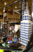 Senior mechanical engineering major Mark Pund of Ferdinand, Ind., works against the clock to reset Purdue University's winning entry in the 2001 National Rube Goldberg Machine Contest at West Lafayette High School. The New York themed contraption, called "The Big Apple," was built by the Purdue chapter of the Society of Manufacturing Engineers. Purdue's entry defeated machines from four other universities today (Saturday, 4/7) to claim the national trophy in the 13th annual event. (Purdue News Service Photo by David Umberger) A publication-quality photograph is available at the News Service Web site and at the ftp site. Photo ID: Rubenat01.reset