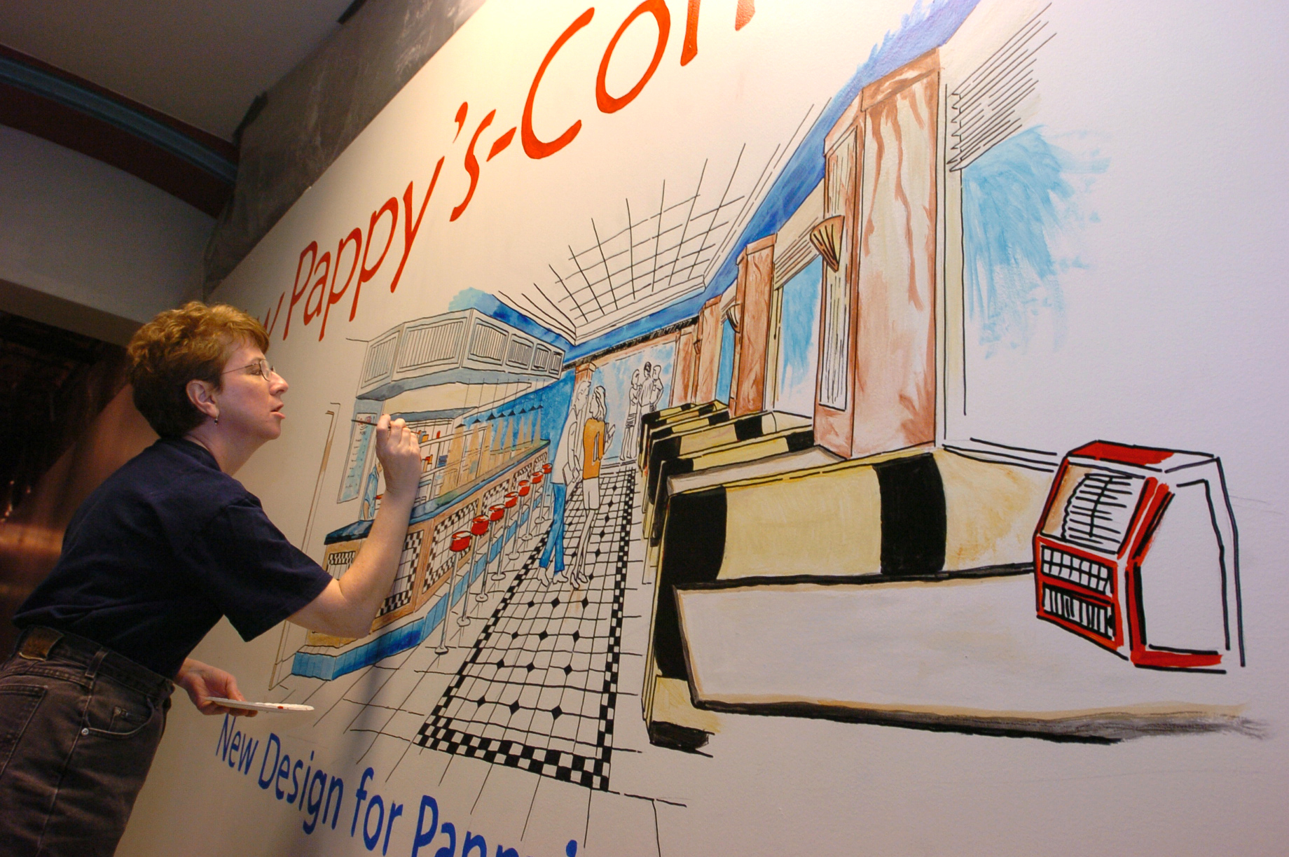 Purdue Memorial Union graphic designer Becky Chapman paints part of a mural on the wall surrounding the renovation of Pappy's Sweet Shop, located on union's first floor. The $1.9 million renovation was started in January and will be finished this summer. Chapman works on the mural Monday through Friday from 3-5 p.m. The collage includes the architect's rendering of the completed renovation, the Pappy's Sweet Shop logo and a portrait of Frank "Pappy" Fox, who managed the Sweet Shop from its opening in 1927 until he retired in 1959. (Purdue News Service photo/Dave Umberger) |