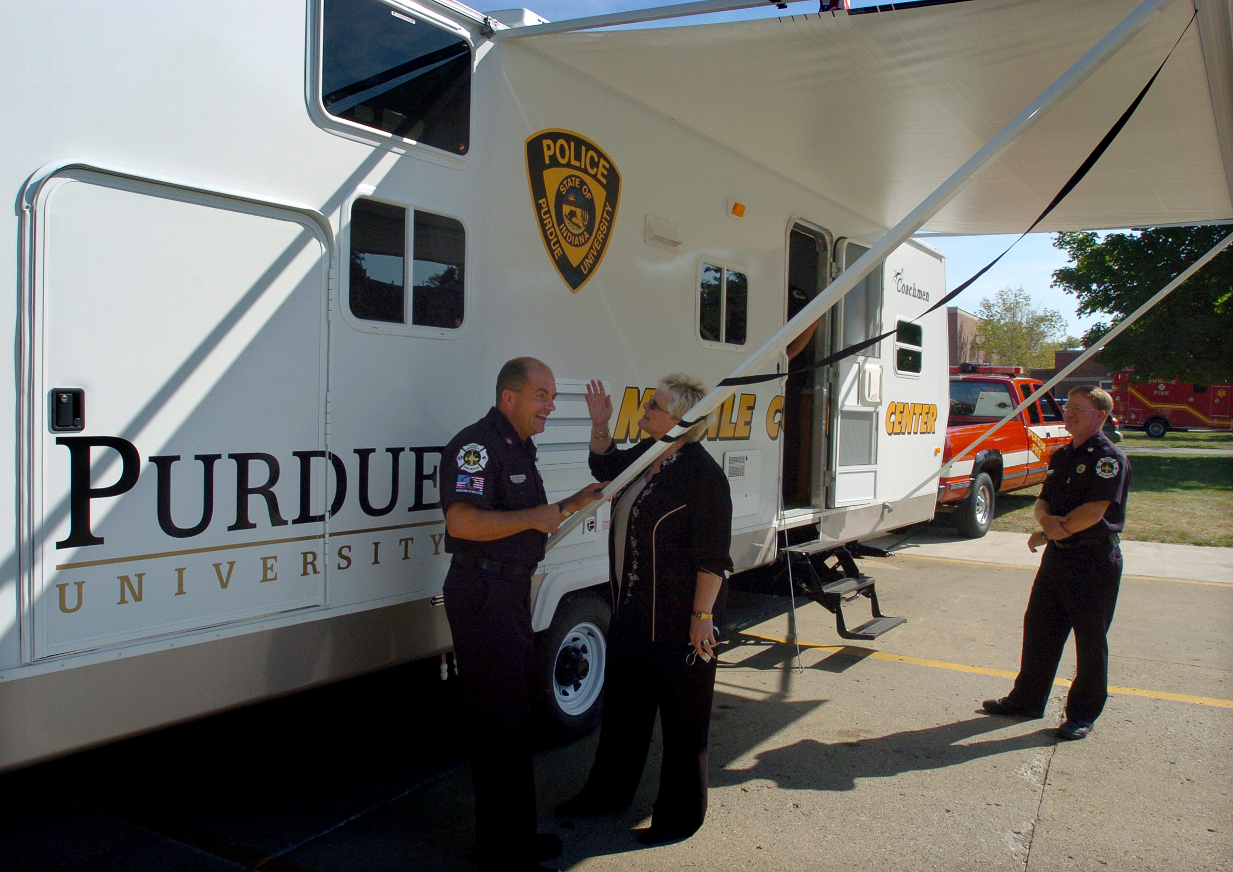 The 2005 Cascade travel trailer, given to the university by Middlebury, Ind., Coachmen Recreational Vehicle Co., will be used by Purdue's police officers, firefighters and other emergency personnel during emergency situations, such as large fires or natural disasters. "This is a piece of equipment that we obviously hope we never have to use for its intended purpose," said Carol A. Shelby, Purdue's senior director of environmental health and public safety. "If we do face a large-scale emergency or disaster, thanks to the generosity of Coachmen, we will have equipment that will help us to better protect our students, faculty and staff."