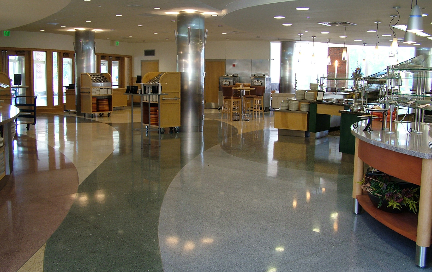 The Fred and Mary Ford Dining Court was honored April 22 at a banquet with the award for Best Tile Marble Terrazzo, which it won over all buildings completed since April 2003 in Indiana and Kentucky. "This award is an honor to Purdue and a testament to the efforts the university is putting not only into serving its students, but also to creating a beautiful campus environment," said Ernest Poland, executive director of University Residences, which operates the dining facility. "Ford Dining Court is the centerpiece of Purdue's efforts to modernize and upgrade our students' dining experiences, and it is appropriate that it would also be a centerpiece for the upgrading and modernizing of the entire campus." The interior of the building includes a colorful terrazzo floor, which in conjunction with the complementary colored and patterned carpet, helps to delineate serving and dining areas. Poland said the floor was a major factor in receiving the institute's award. Terrazzo is a type of flooring made of fine chips of marble laid in cement and polished, allowing for patterns and designs. Also honored with the award were architects Scholer Corp., of Lafayette, Ind.; contractors Santarossa Mosaic and Tile Co., of Indianapolis; Kettelhut Construction, of Lafayette; and the International Union of Bricklayers and Allied Craftworkers Local 4, of Lafayette. In September, Earhart Hall's new dining court was honored by Foodservice Consultants Society International and the American School and University Magazine. Both awards recognized the dining court for excellence in interior design. The two-story Fred and Mary Ford Dining Court, on the corner of Stadium Avenue and Russell Street, opened in August and has seating for 800 and is open to students, faculty, staff and the community. Earhart Dining Court opened in spring 2003 after extensive remodeling. Hillenbrand was reconfigured and opened in fall 2003 as a dining court. Windsor and Wiley dining courts are slated to open by 2005 and 2008, respectively. Like all of University Residences' projects, the $18 million facility will be paid for entirely with funds earned by user fees for the residence halls and dining facilities. University Residences does not use any state funds, or money from the university's general fund. The Indiana/Kentucky Golden Trowel Awards are given every two years and honor excellence in construction and masonry. Other categories include Outstanding Use of New Materials, Best Restoration/Preservation and Best Residential, which honored West Lafayette's Wabash Landing Luxury Apartments in 2003. Writer: Matt Holsapple, (765) 494-2073, mholsapple@purdue.edu Source: Ernest F. Poland, (765) 494-1000, efpoland@purdue.edu Purdue News Service: (765) 494-2096; purduenews@purdue.edu