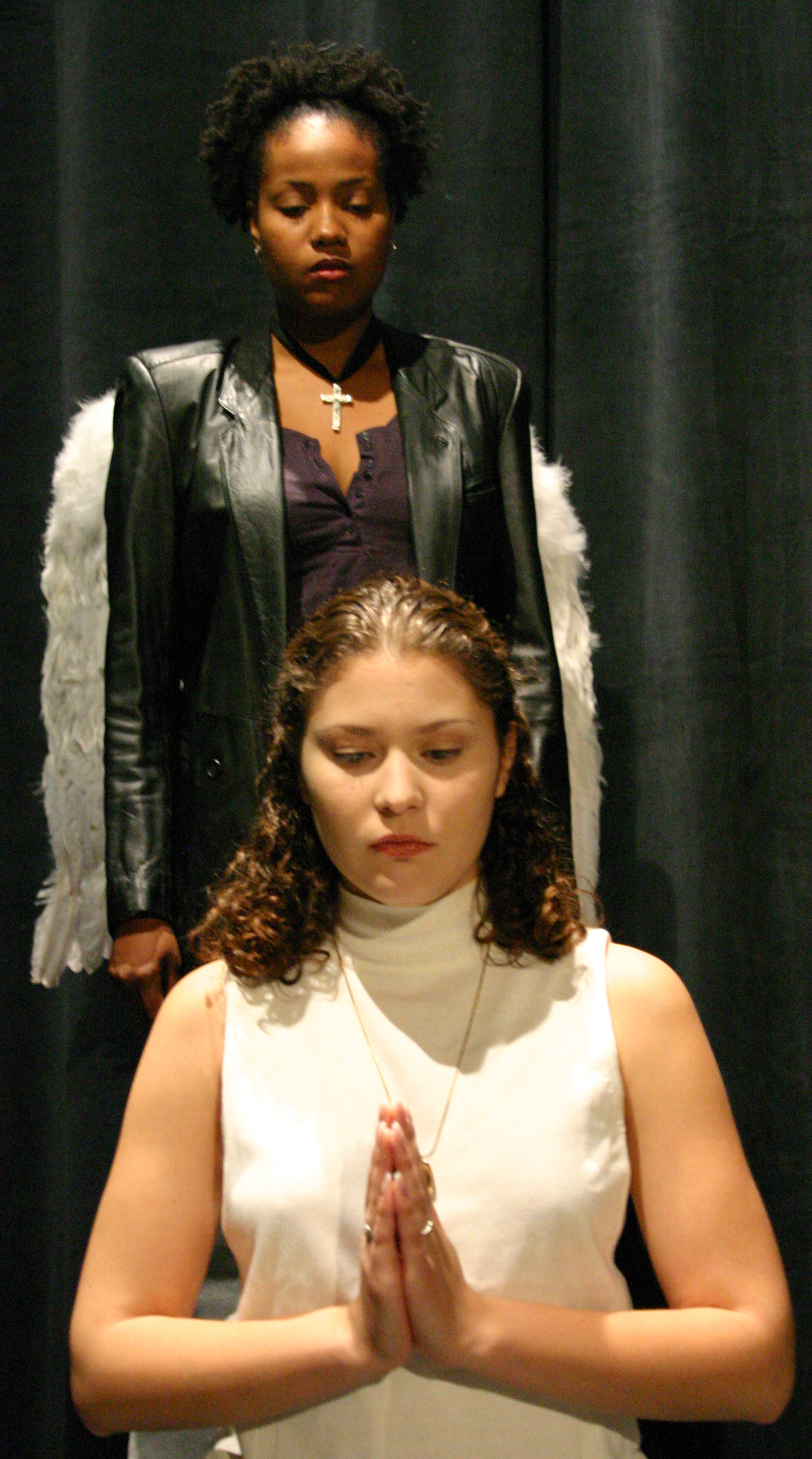 PHOTO CAPTION: A guardian angel, played by Lisa Darden, back, watches over Marisol, played by Adriana Hernandez, in Purdue Theatre's production of José Rivera's "Marisol." The production will run Nov. 10-20 at the Experimental Theatre. (Photo courtesy/Leslie Dionne-Abeyta) A publication-quality photograph of actors in "Marisol" is available at https://www.purdue.edu/uns/images/+2005/marisol-theatre.jpg