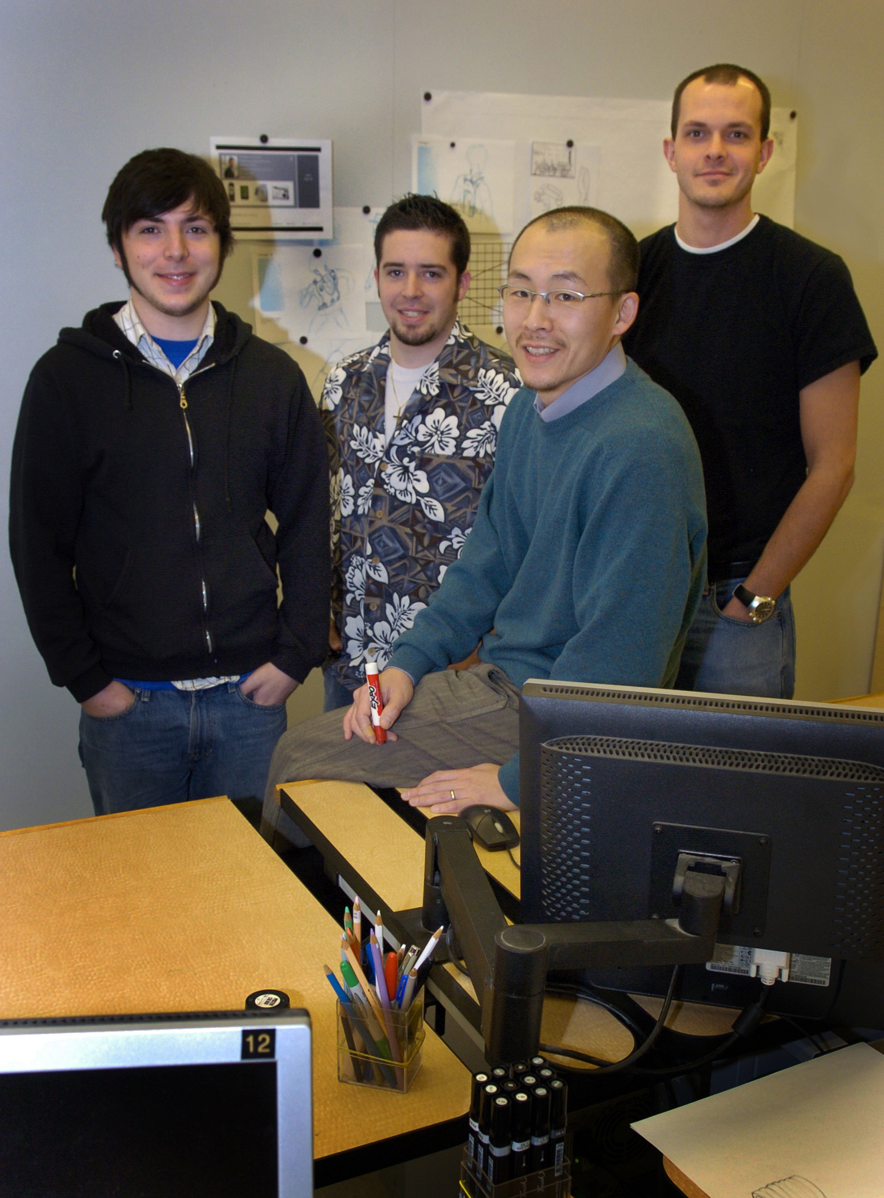 Purdue News Service: (765) 494-2096; purduenews@purdue.edu PHOTO CAPTION Professor Scott Shim's (sitting) senior design students Nick Poteracki from Lake Zurich, Ill., Andrew Monteleone from Indianapolis and R. Alec Cobb from Indianapolis swept a national contest with unconventional designs for a self-filtering water bottle, lasers that mow lawns and massage therapy stones. Poteracki won first place and $5,000 for his new water bottle filter system, Cobb won second place and $2,000 for his lawn mower design that uses laser-based technologies, and Monteleone won third place and $1,000 for his design of new physical and massage therapy devices. Shim also received $2,000 for serving as adviser to the grand-prize winner. (Purdue News Service photo/David Umberger)