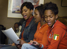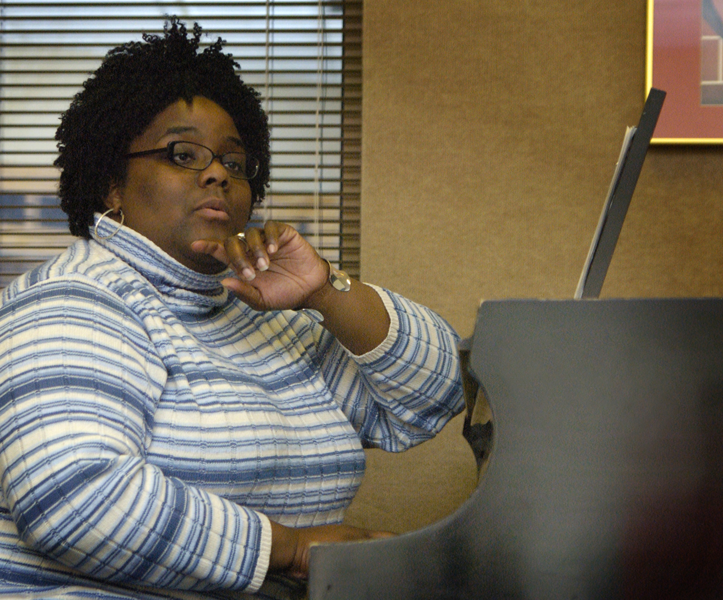 Purdue News Service: (765) 494-2096; purduenews@purdue.edu PHOTO CAPTION: Twana Harris, artist in residence at Purdue University's Black Cultural Center, rehearses with the Black Voices of Inspiration for their spring concert April 2. (Purdue News Service photo/David Umberger)
