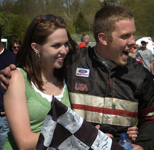 Purdue News Service: (765) 494-2096; purduenews@purdue.edu PHOTO CAPTION:Clayton Smith celebrates his victory today (Saturday, April 22) in the Purdue Grand Prix with fiancee Becky Clark. Smith, a senior majoring in aeronautical and astronautical engineering from Frankfort, Ind., started on the poll and led the entire 50-mile race to claim his second Grand Prix title. (Purdue News Service photo/David Umberger) A publication-quality photo is available at https://www.purdue.edu/uns/images/+2006/grandprix06-winner.jpg