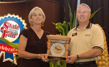 She was recognized by the Purdue University Cooperative Extension Service and Indiana AgriNews, the sponsors of the award that was created to honor women who have excelled and played an important role in Indiana agriculture. The Alexanders together manage 3,200 acres of farmland. At the time of the accident, the farm consisted of 1,800 acres when Tim was left a quadriplegic following a fall from the top of a grain bin. Rather than quit farming, the Alexanders decided to continue the operation with Sue assuming many of the physical tasks that Tim could no longer handle. The average day for this mother of three includes moving farm equipment, sweeping grain bins, arranging for bank loans or loading a planter. In addition, she sees to the needs of her husband and family, and volunteers in the community. "We are all inspired by what you and Tim have done for agriculture and your community of Winamac," said Randy Woodson, Glenn W. Sample Dean of Agriculture, who honored her with a handmade wooden clock. While she was the one receiving the award, Alexander said she couldn't have done so without the help of her family and the farm's invaluable two hired hands. "Sue is a typical farmwife working on the farm," said Stacy Herr, Purdue Extension educator and award coordinator. "We chose to recognize her as she epitomizes the achievements of many women in agriculture across the state of Indiana." Sue Alexander, a graduate of Purdue University with a degree in farm business management, is also active in the 4-H program, the Pulaski County Community Foundation Board, the school improvement committee at Winamac High School, the Pulaski County YMCA program committee and other local events. Women eligible for the award could participate in production agriculture, agribusiness or entrepreneurial agriculture enterprises. All nominees had to reside in Indiana and be part of an agriculture enterprise or agribusiness that operates in Indiana. Writer: Beth Forbes (765) 494-2722, forbes@purdue.edu Sources: Sue Alexander, (574) 946-6331 Randy Woodson, (765) 494-8392 Stacy Herr, (765) 973-9281, sherr@purdue.edu
