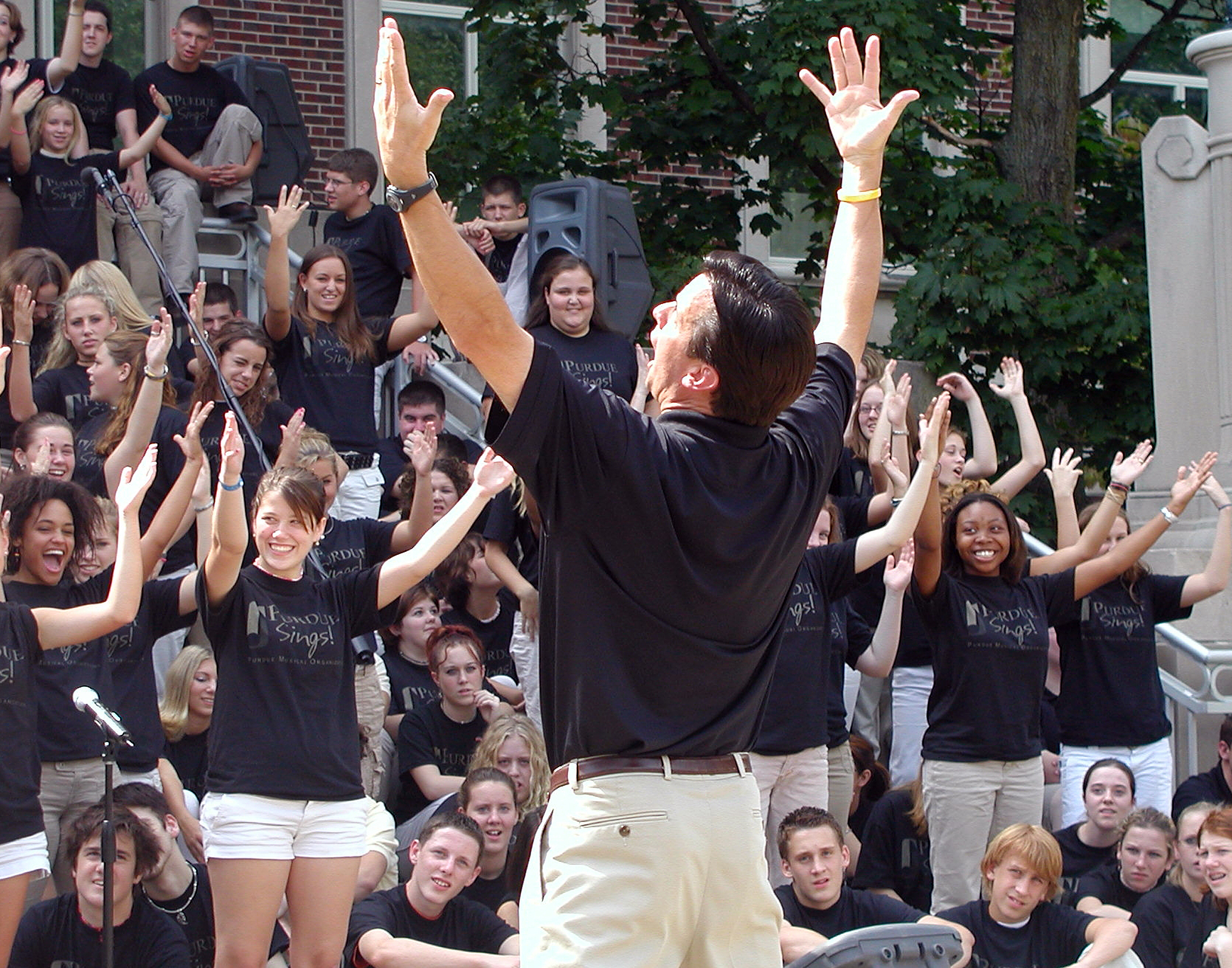 Purdue News Service: (765) 494-2096; purduenews@purdue.edu PHOTO CAPTION:Students from Indiana high school music programs interact with Purdue Musical Organizations director Brian Breed during last year's Purdue Sings. This year's event will be held at 4 p.m. Sept. 9 on the steps of Hovde Hall. (Purdue Musical Organizations photo)