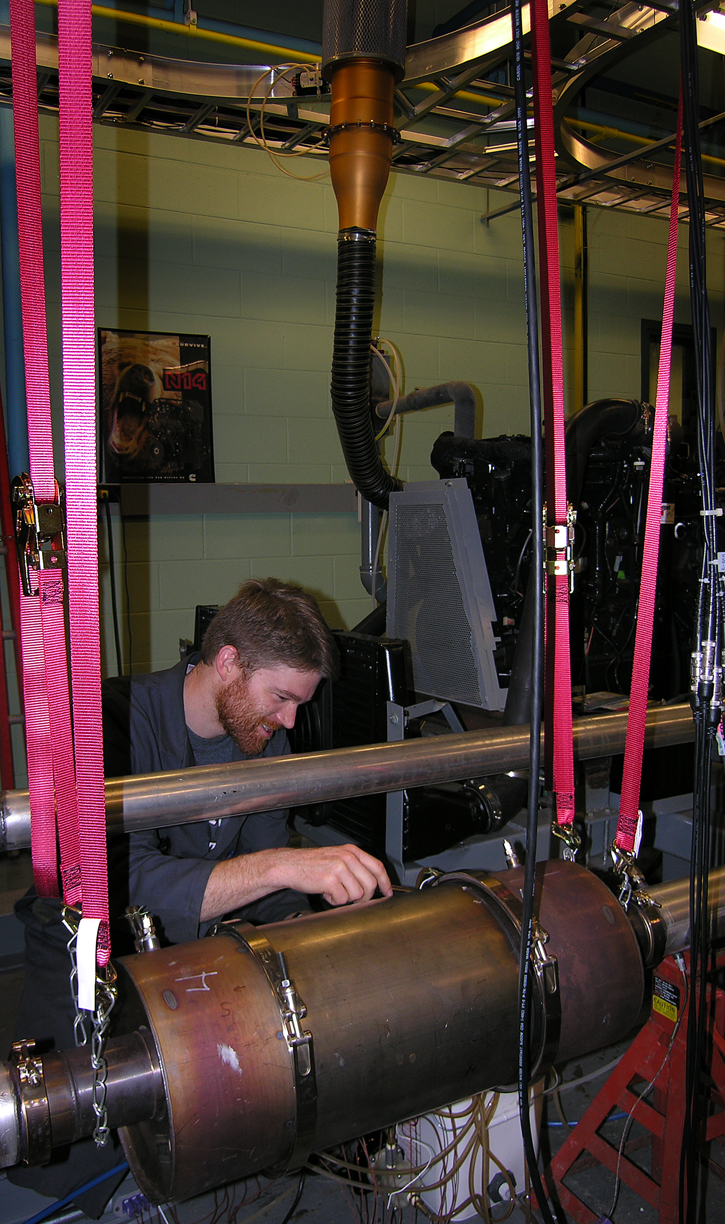 Purdue News Service: (765) 494-2096; purduenews@purdue.edu PHOTO CAPTION:Patrick Cunningham, a doctoral student in the School of Mechanical Engineering, conducts diesel engine research at Purdue's Ray W. Herrick Laboratories. Cummins Inc., a diesel industry manufacturer in Columbus, Ind., donated $1.75 million for facility and laboratory improvements and an endowed professorship for mechanical engineering. (Purdue News Service photo/David Umberger) A publication-quality photo is available at https://www.purdue.edu/uns/images/+2006/cummins-herrick.jpg