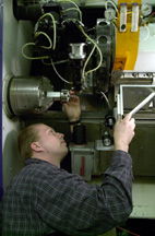 Purdue doctoral student Frank E. Pfefferkorn adjusts a lathe used in research into laser-assisted machining of ceramic parts. (Purdue News Service Photo by David Umberger)