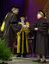 "Steven Beering's tenure as president has been one of the most important in Purdue's 131-year history," J. Timothy McGinley, chairman of Purdue's board of trustees, said just before awarding the degrees at the second of four commencement ceremonies held this weekend in Elliott Hall of Music on the West Lafayette campus. "He has taken this university to new heights of excellence in scholarship, research, development, private fundraising, capital improvements and national and international prominence. "He and first lady Jane Beering have motivated and inspired the entire Purdue family as a tireless team since 1983. What he achieved in his office in the ensuing 17 years, as well as on this campus, and around this nation and the world in support of Purdue and its people has been absolutely remarkable. That legacy has positioned Purdue for ever-higher levels of greatness in the new millennium. And all of us in the Purdue family are thankful for that." President Beering was awarded an honorary doctorate of science. Mrs. Beering was awarded an honorary doctorate of hospitality management. McGinley said the diplomas traveled in the space shuttle Endeavor with Purdue alumnus Jerry Ross. Beering has announced he will step down June 30 or whenever a new president can be installed. A search committee has been at work since fall looking for his successor. While Beering has been at Purdue, enrollment at the West Lafayette campus has grown from 32,455 to a record 37,746 this past fall. International student enrollment has gone from 1,334 students to 4,133 students from 127 countries. Purdue has more international students than any other public research institution. The university has awarded more than 164,000 degrees during Beering's tenure. Beering's administration has been marked by efforts to emphasize undergraduate teaching and enhance faculty recognition through the creation and funding of special professorships. The number of distinguished and named professorships has grown from 21 in 1983 to 70 today. Beering also has led a major effort to build and beautify the university's campuses. Major construction projects completed on the West Lafayette campus under his administration have included a Liberal Arts and Education Building; Hillenbrand Hall, a student residence; the new Black Cultural Center; a new food science and biotechnology complex; and major additions to the engineering, veterinary medicine and athletic complexes, including golf course renovations. Additions to the Krannert Graduate School of Management, the Schools of Engineering, an aquatics center and a creative arts center are now planned or under construction. The campus landscape and skyline have been transformed by a new bell tower and the creation of several outdoor malls. During his administration, annual support for sponsored research has grown to more than $130 million. In 1989, Beering launched the Vision 21 campaign, the most ambitious private fund-raising effort in Purdue's history. In five years, it raised more than $330 million, surpassing its goal by more than $80 million. Purdue's endowment in 1983 was $121 million. Today it exceeds $1 billion. Beering was named the ninth president of Purdue in 1983 after serving as dean of the Indiana University School of Medicine and director of the I.U. Medical Center. A summa cum laude graduate of the University of Pittsburgh, he subsequently was graduated from the Pitt School of Medicine and spent more than 12 years in the U.S. Air Force Medical Corps. During his military career, he served as an adviser to the U.S. surgeon general in internal medicine and was a medical consultant on the U.S. space programs' early attempts to put humans in orbit. He has held senior positions with numerous national and state committees, boards of directors and educational policy-making groups. He is the immediate past president of the Association of American Universities and was co-chairman of the NCAA Presidents' Commission Subcommittee on Gender Equity. He is a member of the National Academy of Science/Institute of Medicine. Jane Beering has played a key role in support of Purdues philanthropic efforts since arriving on campus in 1983, in particular through her interaction with alumni and friends, corporate partners and civic leaders. She oversaw the renovation and expansion of the presidents residence, Westwood, and has hosted more than 100 events a year involving some 12,000 Purdue alumni, faculty, staff, and friends annually. At Westwood, she regularly hosts student organizations for recognition and honorary events. She is past president of the National Association of State Universities and Land-Grant Colleges Council of Spouses, and compiled and edited the handbook for the associations spouses. She is a expert needleworker and designer, specializing in crewel, canvas and counted-thread embroidery. She was a founder of the Indianapolis chapter of the Embroiders Guild of America, and past chair of the Guilds National Master Craftsman Program in Crewel. She also devotes her time to a range of service and arts organizations in Greater Lafayette and Indianapolis. Born and reared in Pittsburgh, Mrs. Beering graduated magna cum laude from the University of Pittsburgh with a bachelors degree in international political science, and was elected to Phi Beta Kappa national honor society. She held positions with the Central Intelligence Agency in Washington, DC, and the International Division of Mine Safety Appliances Company in Pittsburgh prior to raising a family of three sons. The Beerings were married in December 1956 and have three adult children. Writer: J. Michael Willis, (765) 494-0371; mwillis@purdue.edu Purdue News Service: (765) 494-2096; purduenews@purdue.edu PHOTO CAPTION: Purdue President Steven C. Beering (center), and his wife, Jane, receive surprise honorary doctor of science and doctor of hospitality management degrees, respectively, this morning (Saturday, 5/13/00) by J. Timothy McGinley