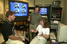 Jennifer Talavage, a doctoral candidate in electrical engineering at Purdue University, explains her research in video streaming for the Internet to Noel Marsden (left) and Brian Krum, two MBA students. The three students are working as a team transform academic research into marketable products as part of the Innovation Realization Laboratory, a project funded by Purdue and the National Science Foundation. (Purdue News Service Photo by David Umberger)