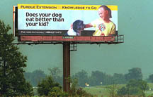 September 22, 2000 Extension campaign offers nutrition info for familiesWEST LAFAYETTE, Ind. Does your dog eat better than your kid? That's the question posed on billboards along I-65 between Lebanon, Ind., and Indianapolis, and also on I-70 between Plainfield, Ind., and Indianapolis. The billboards, which feature a girl with a lollipop, a dog, and the question, were placed by Purdue Extension administrators to encourage people to contact Extension for information on foods and nutrition and other topics.