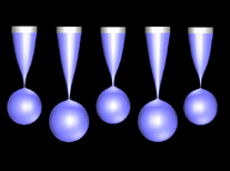 This diagram illustrates a phenomenon called "period doubling," in which the droplets coming out of a nozzle are not always the same size. Instead, every other drop, or every fourth drop, is the same size, depending on how fast the liquid is being sprayed. Period doubling decreases the precision of equipment used for combinatorial chemistry, in which thousands of experiments are carried out simultaneously to speed up the discovery of new drugs and other products. Purdue University chemical engineering Professor