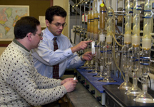 Purdue chemist Hicham Fenniri (right) and Hartmut Hedderich, director of Purdue's laser facility, examine a series of specially designed beads that will allow pharmaceutical researchers to screen for potential drug candidates many times faster than is possible using current methods. (Purdue News Service Photo by David Umberger)