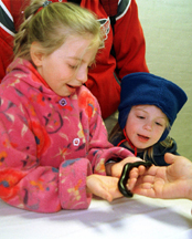 Hannah Becker handles a nine-inch tropical millipede as sister, Erica, looks on at Purdue's Bug Bowl. Both girls are from West Lafayette. (Purdue News Service file photo by David Umberger)