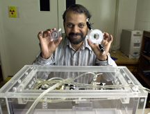The experimental power system would be ideal for satellites, including those in a geosynchronous orbit, which are exposed to a day-night cycle similar to the Earth's. The system would generate electricity during hours of darkness, when conventional solar-power systems rely on bulky rechargeable batteries. Because experiments conducted on the space shuttle can cost millions of dollars, the engineer devised a way to conduct experiments on Earth at a fraction of the cost. "We can perform the same test in the laboratory for less than $100,000," said Shripad Revankar, an associate professor of nuclear engineering at Purdue. He will present a paper detailing the work on Sunday (6/10), during the 35th National Heat Transfer Conference in Anaheim, Calif. The conference is sponsored by the American Society of Mechanical Engineers, the American Institute of Aeronautics and Astronautics, and the American Institute of Chemical Engineers. The research paper was written by Revankar; Patrick George, an engineer at the NASA Glenn Research Center, in Cleveland; and Purdue graduate student Travis Croy. During daylight hours, portions of the experimental satellite system exposed to solar radiation in the vacuum of space would reach 800 degrees Celsius, or more than 1,400 degrees Fahrenheit. Central to the solar-power system is a "phase-change" material that is liquid under high temperature, which then freezes during hours of cold darkness. Because heat from the sun is required to melt the material, heat is released when the liquid freezes. The heat released by the freezing liquid can then be used to generate electricity by driving small steam turbines or devices called thermoelectric units. A phase-change solar energy system would be more compact and would store more energy than conventional systems that use rechargeable batteries. Such systems are used to provide energy for solar homes and other solar-power applications. Because the systems generate at least three times more power than batteries of comparable size, they are seen as a possible alternative to conventional satellite solar-power systems that rely on batteries. However, engineers are trying to make the system more efficient so that it will be practical for space vehicles. But a major obstacle is that bubble-like cavities, or voids, form in the material as it freezes. "The problem is these materials shrink a lot when they freeze," Revankar said. "That means you have a large gap." The phase-change material is contained in a series of metal cells, called capsules. Gaps that form against the outer walls of the capsules interfere with the flow of heat from the freezing liquid to the rest of the system. "If a void is against the wall of a capsule, heat cannot be transferred efficiently," Revankar said. The repeated formation of gaps against the metal walls also can damage the capsules over time. Revankar has found that voids might be controlled by using capsules of certain sizes and shapes. He has found, for example, that the best shape and size for the vessels is a donut, or torus, about two inches wide. New satellite solar-power systems would contain a series of such donut-shaped capsules filled with a phase-change material. "We are investigating various geometries," Revankar said. "NASA wants to optimize the design so that it has excellent heat transfer characteristics." Revankar has made it possible to conduct the experiments on Earth. He designed transparent capsules made of plastic, enabling researchers to see what is happening inside the vessels as the gaps form. Revankar also uses phase-change materials that melt at low temperature, which are much easier to work with than materials that melt at 800 degrees Celsius. One of the materials that he uses remains transparent while frozen, permitting researchers to take detailed photographs of gap formation. "We take pictures in the lab when they are freezing to see how many voids there are and how they are distributed inside," Revankar said. "This will tell us, for example, how many voids there are in the center and how many migrate to the walls." Test results are then subjected to mathematical analysis, and the findings are used to create computer models that might enable engineers to design better capsules. In contrast, experiments conducted on the space shuttle can't be analyzed until the frozen phase-change material is returned to Earth and cut into slices for analysis. Ultimately, researchers are trying to figure out the physical mechanisms involved in the formation and movement of cavities inside the capsules. Because the formation of gaps in the capsules is not affected by the weightless environment of space, the results of Earth-based experiments can be applied to space systems, Revankar said. Experiments conducted on Earth also are more thorough because they are not limited to the short duration of a space shuttle flight. The research is funded by the National Aeronautics and Space Administration. Source: Shripad Revankar, (765) 496-1782, shripad@ecn.purdue.edu Writer: Emil Venere, (765) 494-4709, venere@purdue.edu Purdue News Service: (765) 494-2096; purduenews@purdue.edu CAPTION:Shripad Revankar, an associate professor of nuclear engineering at Purdue University, displays the plastic "capsules" he has designed to test an experimental solar-power system for space vehicles. Revankar has designed the experiments so they can be conducted on Earth, making them far less expensive than research carried out on the space shuttle. (Purdue News Service Photo by David Umberger) A publication-quality photograph is available at the News Service Web site and at the ftp site. Photo ID: Revankar.solar ABSTRACT Void distribution in phase-change material capsule of solar latent heat energy storage system Shripad T. Revankar and Travis Croy, School of Nuclear Engineering, Purdue University, and Patrick J. George, Space Flight Project Branch, NASA Glenn Research Center Thermal energy storage (TES) systems em