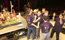 The second-place trophy and $150 went to Theta Tau and Phi Sigma Rho, the engineering fraternity and sorority joint team, for a machine called "Rube Junior." Their entry also was selected the People's Choice Award winner by more than 300 people attending the competition at the Elliott Hall of Music. Third place and $50 went to the Society of Women Engineers for their space-themed "Made it to the Moon" machine. The winning team dedicated more than 700 man-hours since September working on their entry. "We collected ideas from trips to science museums, which were a wonderful source of inspiration, and even "Junkyard Wars" on the Learning Channel, which is the epitome of Rube Goldberg," Jordan said. "We came up with a theme and then did a storyboard to map out and link our steps." For judges, the level of work and creativity that goes into building the machines makes picking a winner a difficult task. "Every year it is amazing to see the talent these students show," said Jerry Dale, one of this year's judges from Louisville Ky., and a 1988 Purdue graduate representing contest-sponsor General Electric. "It's fascinating to see students' creative approaches to these tasks and to exercise their engineering skills, have fun and work as a team." Judge Eric S. Furgason, Purdue professor of electrical and computer engineering, called this year's competition "the hardest contest I've judged." Furgason also serves as an adviser to the local contest. General Electric Corp., radio stations 93.5 WKHY and B102.9, and Kinko's helped sponsor the contest. The Society of Professional Engineers' team will compete in the Theta Tau National Rube Goldberg Contest on April 6 at the Cumberland Exhibition Center in West Lafayette. The national contest is organized by student members of the Purdue chapter of Theta Tau, a professional engineering fraternity, with support from Rube Goldberg Inc. Writer: Grant Flora, (765) 494-2073, gflora@purdue.edu Source: Willie Karashin, contest chairman, (765) 743-0837, mighty_tortilla@yahoo.com Purdue News Service: (765) 494-2096; purduenews@purdue.edu Related Web sites: PHOTO CAPTIONS: A publication-quality photograph is available at https://news.uns.purdue.edu and at ftp://ftp.purdue.edu/pub/uns/. Photo ID: rube02.winner.jpeg Members of the Theta Tau-Phi Sigma Rho team react to a clean run of their People's Choice Award winning entry in the Rube Goldberg Machine Contest Saturday (2/9) at Purdue. David Geswein, a senior from Plainfield, Ind.; Rebecca Castillo, a junior from Pittsboro, N.C.; and Brian McGowan, a senior from Orlando, Fla., cheer on their entry, titled "Rube Junior." The contraption also placed second in the overall competition. Machines in this year's event had to secure, raise and wave the national flag. (Purdue News Service Photo by David Umberger) A publication-quality photograph is available at https://news.uns.purdue.edu and at ftp://ftp.purdue.edu/pub/uns/. Photo ID: rube02.choice.jpeg