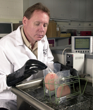 The scientists used sliced bologna tainted with Listeria monocytogenes, packaged it in vacuum-sealed plastic bags, and then submerged the packages in hot water, said lead researcher Tim Haley of Purdue's Center for Food Safety Engineering. Next, they immediately placed the bagged luncheon meat in cold water. This two-step procedure killed the microbes and also apparently extended the meat's shelf life. The pasteurization method is called a high-temperature-short-time process. Although bologna and Listeria were used for this study, the process could be applied to similar deli meats and could eliminate other pathogens. Haley said the method possibly could be part of a national biosecurity system to protect against deliberate attempts to cause illness through food contamination. Haley will present his findings at the Institute of Food Technologists' annual national meeting June 15-19 in Anaheim, Calif. "The problem with ready-to-eat meats, including luncheon meat, hot dogs and deli meat, is that prior to final packaging, Listeria still can contaminate it," said Haley, an assistant professor in the Department of Food Science and director of the Computer Integrated Food Manufacturing Center. "This can happen if the bacteria are present in the air, on the equipment or in the water in the processing plant. If the food handlers have been exposed to Listeria, they can spread it even if they are wearing gloves." Researchers have focused on Listeria because as few as 10 of the bacteria cells can cause illness and, though it is a relatively rare biological contaminant, its fatality rate of 20 percent is the highest of the food pathogens, according to the Centers for Disease Control and Prevention. Haley and his team began investigating pasteurization as a possible way to eliminate food pathogens from ready-to-eat meats because similar processes have been used for other foods, and they also wanted something food manufacturers could easily and quickly implement. The research enabled the scientists to calculate the temperature and time needed to kill as many as 1 million of the organisms on one slice of bologna, Haley said. According to this model, the pasteurization process would require 85-degree Celsius (185 F) water for 20 seconds in such a scenario. If two slices were pasteurized, the length of hot water immersion would be increased to 60 seconds, and for four slices, 180 seconds. This would be followed by a 4-degree Celsius (39 F) water bath for the same amount of time as in the hot water. However, the scientists report that it's not practical to do more than two slices in a package using the method. This is because the amount of time needed to pasteurize more than two slices would cause too much quality degradation. But with just two slices in a package, the process didn't harm the quality of the bologna, Haley said. The researchers used both low-fat and regular bologna that can be purchased in retail food stores. His research team will study ways to modify the process to accommodate meats with higher fat content. In addition, having one or two slices wrapped together would be a convenience to consumers, in much the same way as individually wrapped cheese slices, Haley said. The process also appears to extend the product's shelf life. Some of the post-packaging pasteurized meat from the study has been refrigerated since December 2001 and, after five months, its quality is comparable to fresh packed bologna, Haley said. "This approach is similar to the pasteurization method used for canned food and milk, so it should be acceptable to consumers as a safeguard against bacterial contamination," he said. "It will be easy for food processors to implement. This type of pasteurization also will allow pregnant women peace of mind." Pregnant women and people with weakened immune systems are particularly vulnerable to Listeria-caused illness and death, according to the CDC. The death rate in immuno-compromised populations is between 34 percent and 70 percent. Compared to other healthy adults, pregnant women are 20 times more likely to develop listeriosis, the disease caused by the bacteria. The bacteria are additionally dangerous because they can survive refrigeration and also can be found in raw meat, milk and cheese. The Clinton administration issued a "no tolerance" policy for Listeria , which means that if one organism is found on one piece of food, the whole batch must be discarded and/or recalled from stores, warehouses and consumers' shelves. A 1999 multistate exposure to the bacteria caused 21 deaths, five miscarriages and the recall of more than 15 million pounds of frankfurters, according to the CDC. Last month, John Morrell & Co. of Cincinnati recalled 140,000 pounds of frankfurters and hot dogs that possibly were Listeria tainted, the U.S. Department of Agriculture Food Safety Service reported. The other researchers involved in the study are Osvaldo Campanella, associate professor in the Department of Agricultural and Biological Engineering; Arun Bhunia, associate professor in the Department of Food Science; and David Gerrard, professor in the Department of Animal Sciences. Purdue's Center for Food Safety Engineering includes nearly 90 university scientists studying ways to more quickly and exactly detect and protect against biological and chemical contaminants of food. They are collaborating with scientists from the USDA's Agricultural Research Service and other agencies. The USDA Agricultural Research Service provided funding for this study. Writer: Susan A. Steeves, (765) 496-7481, ssteeves@aes.purdue.edu Source: Tim Haley, (765) 494-9093, haleyt@foodsci.purdue.edu Ag Communications: (765) 494-2722; Beth Forbes, bforbes@aes.purdue.edu; https://www.agriculture.purdue.edu/AgComm/public/agnews/ Related Web sites: PHOTO CAPTION: A publication-quality photograph is available at ftp://ftp.purdue.edu/pub/uns/haley.pasteurize.jpeg.