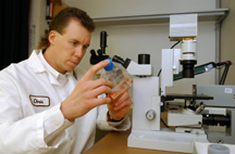 Christopher Leamon, Endocyte's vice president of research, works to develop Purdue University-licensed technology that involves attaching various markers to the vitamin folate to enable the body's immune system to "see" cancer and eradicate it without damage to surrounding tissues. (Purdue News Service Photo by David Umberger) A publication-quality photograph is available at ftp://ftp.purdue.edu/pub/uns/endocyte.leamon.jpeg. ABSTRACT Folate targeting of haptens to cancer cell surfaces mediates immunotherapy of syngeneic murine tumors Authors - Yingjuan Lu and Philip S. Low A variety of human cancers over-express a cell surface receptor with high affinity for the vitamin, folic acid (Kd~lO-10 M). Covalent attachment of folic acid to virtually any molecule or particle has been shown to yield a conjugate/complex that can bind to and enter folate receptor-bearing cells via the same endocytic pathway followed by free folic acid. Here we report on the use of folic acid to target covalently attached imaging and immunotherapeutic agents to cancer tissues in vivo. Using both optical and radio imaging agents (with the aid of laser and gamma scintigraphic instruments, respectively), we first demonstrate that folate conjugates concentrate in a variety of tumors in both humans and mouse tumor models. We then demonstrate that this tumor-specific delivery can be utilized to convert poorly immunogenic tumors into highly immunogenic target tissues. By linking folic acid to a novel hapten, we have been able to decorate folate receptor-expressing cancer cell surfaces with >106 haptens/cell in vivo. Following marking of such cells with haptens, the cells are observed to become opsonized with autologous anti-hapten antibodies, which in turn mediate the cells' removal via antibody-dependent cellular cytotoxicity (ADCC). Supplemental administration of low levels of ADCC-activating cytokines (e.g. IL-2 and IFN-) is shown to synergize with the folate-targeted immunotherapy. Thus, using M109 syngeneic lung cancer cells injected intraperitoneally into Balb/c mice that were previously immunized against fluorescein, a significant extension of lifespan is observed following treatment with folate-fluorescein conjugates, and complete cures are observed upon supplementation with moderate levels oflL-2 and IFN-. Because control tumor-bearing mice treated with the same cytokines, but with non-targeted fluorescein, show minor extension of lifespan, we conclude that tumor-sp6cific opsonization is an essential step in the immunotherapy. Finally, because the anti-fluorescein antibodies are unable to access the folate receptors on the apical membranes of the kidney proximal tubules, no kidney or other normal tissue cytotoxicity is observed. These data suggest that retargeting of haptens to folate receptor-expressing cancers might constitute a method for mobilizing the immune system specifically against poorly immunogenic tumors.