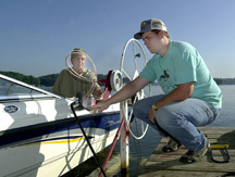 Krutz says the device could replace electric motors currently used by boaters, and is much easier than hand-cranking a boat out of the water. "From a safety standpoint it makes sense," Krutz says. "Having an electrical hot wire on a boat dock means you could have a problem." Krutz says maintaining electrical power at a private dock or small marina can be troublesome. "Near the water you have constant moisture, and when it comes to maintaining an electrical system it will drive you nuts," he says. "Everything gets moldy and green after two years. Then one winter some varmint chews through the insulation during the winter, and when you turn it on in the spring you blow your fuse or you get a very lively area." Martin says he surveyed local marinas to see if such a device would be welcome and found it was. "They were all for a different method to raise boats," he says. "They said that running conduit along the docks is always a problem." Martin constructed the pneumatic boatlift using a standard air compressor, such as those one might find in a local hardware store. "We wanted to keep it simple," he says. "A bigger compressor is very expensive." The pneumatic boatlift was designed to work to standard friction drive boatlifts. It would only replace the electric motor, not the entire device. The airlift is powerful enough to raise an 18-foot boat, and it also would work for a 21-foot boat or a pontoon boat, Krutz says. "It's not designed to raise those 35-footers, but those only get lifted out of the water once a year," he says. Although the compressor itself uses electricity, it can be placed away from the dock. Martin and Krutz designed the system to have the compressor 60 feet from the dock, but in tests they have placed the compressor as far as 250 feet away from the dock and run air hose to the dock to power the lift. "There was very little loss of power," Krutz says. "It was less of a power loss than if you had run an electrical line down to the dock." Krutz says he expects an air-powered boatlift would cost about the same as current electrical boatlifts. "Electrical boatlifts cost around $600, and we built this prototype for $700, so I don't think that if one were produced on a commercial scale that it would cost any more than what is on the market now," he says. Martin says having compressed air at the boat dock has other advantages, too. "Many boaters like to pull tubes behind their boats, and this makes it easy to inflate the tubes at the dock," he says. "You can also attach a blowgun to the air line and clean out the boat at the end of the day." Martin developed the pneumatic boatlift as his final senior engineering project for Purdue Course ABE 485: Agricultural Equipment Design, which Krutz teaches. Despite all of the noodling required to engineer the device, Martin says that wasn't the hardest part of the project. The most important lesson he learned while working in a pseudo-industrial environment was that you have to focus on the human resources. "The hardest part was dealing with people. The most difficult part of the project was getting things delivered in the time allotted," Martin says. "I learned that dealing with people is the one of the most critical parts of a project, just like in industry." Since graduating in May with a degree in agricultural and biological engineering, with an emphasis in machine systems, Martin, who is originally from Kouts, Ind., has worked for Turblex Inc. of Springfield, Mo., as a engineering project manager working on large industrial air compressors. "The experience of my senior design project has helped tremendously in this position," he says. "You get a real-world flavor from Professor Krutz's classes that is very valuable." Writer: Steve Tally, (765) 494-9809; tally@purdue.edu Sources: Gary Krutz, (765) 494-1179; krutz@purdue.edu Matt Martin, (417) 864-5599; mmartin@turblex.com Ag Communications: (765) 494-2722; Beth Forbes, bforbes@aes.purdue.edu; https://www.agriculture.purdue.edu/AgComm/public/agnews/ PHOTO CAPTION: A publication-quality photograph is available at ftp://ftp.purdue.edu/pub/uns/krutz.boatlift.jpeg. Purdue News Service: (765) 494-2096; purduenews@purdue.edu