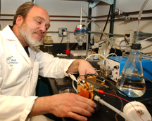"Fuel cell system technology hasn't advanced much since it was developed to support the manned space effort in the 1960s," says John Rusek, Swift's founder and chief engineer, and an adjunct professor in Purdue University's School of Aeronautics and Astronautics. "A fuel reformation system converts hydrogen-containing fuel to hydrogen that the fuel cell can use," Rusek says. "The hydrogen, carbon dioxide and additional trace components produced by the conversion process are called reformate fuel. These reformate fuel cells emit greenhouse gases and create other environmental concerns. We're working on direct, nontoxic fuel cells that are cleaner, safer, more powerful and more reliable." Mary Rusek, Swift's co-founder and president, says, "Fuel cells have many advantages over batteries. A traditional battery is a closed system, which means that once the chemical reaction is finished, the user either has to recharge the battery or buy a new one. Fuel cells, however, operate as an open system. Fuel or gas flows through the cell on demand. Once all of the fuel is consumed, more can be added to make the cell produce more energy. "In addition, robust fuel cells don't have a shelf life because their chemical reaction can be turned on and off. Inside a battery reactions are always taking place, even if the battery is not in use." John Rusek asks, "How many times have you needed to use a flashlight only to discover that the battery was dead? With fuel cells, I can accurately determine how much power the cell can generate at any given time, and when power is gone, I can recycle the cell." Swift also holds patents involving highly concentrated hydrogen peroxide as it relates to propulsion. Propulsion, John Rusek says, can be achieved with hypergolic fluids (fuels that burn on contact with an oxidizer) that allow satellites and missiles to make minute directional adjustments as controllers start and stop the flow of liquid and, thereby, start and stop the burn. Unlike oxygen mixing with gasoline in an internal combustion engine, hypergolic propellants are safer because they don't need a spark to set off a reaction. These chemicals react with each other at any level of concentration and never reach a point at which they become explosive. The company's research team is using hydrogen peroxide to create hypergolic propellants that are nontoxic. Peroxide, as opposed to conventional hypergols, is a better power source because it is much less poisonous to humans and the environment, John Rusek says. The National Aeronautics and Space Administration (NASA) still uses toxic hypergolic propellants that are carcinogenic and require astronauts to wait at least one hour before departing the space shuttle while these propellants are safely off-loaded. To feed electricity to the on-board computer system of a rocket, Swift has designed what they call an "on-the-fly" fuel cell, in which a small amount of nontoxic propellant is diverted to flow through a semi-solid-state fuel cell in order to produce the electricity needed. The chemical propellants Swift has developed with funding from the Department of Defense for satellites, space shuttles and missiles have other applications, including automotive uses. "I really have a problem with pumping oil a thousand feet out of the ground, shipping it halfway around the world, and refining it just to burn it," John Rusek says. "Our hypergolic hybrids are based on a renewable source, such as methanol or ethanol made from biomass, and can be injected directly into a fuel cell to power an electric motor." The company also has applied for a patent in the field of bioelectrocatalysis, using hydrogen peroxide to generate electrical energy. As hydrogen peroxide decomposes, it normally generates water, oxygen and heat in reactions that do not provide a significant amount of usable energy. Swift has developed a way to increase the amount of energy released. The next step in Swift Enterprises' research is the development of several prototypes, for which the Ruseks plan to partner with Indiana-based manufacturers. A rural electric company has discussed working with Swift to develop a propane-based fuel cell for agricultural operations. Silent and with no long-distance wiring, this fuel cell would provide power to an entire farm without noise. With a $172,000 grant from the Indiana 21st Century Research and Technology Fund, the Ruseks founded Swift Enterprises in 2001 and began obtaining federal research grants, including a Pentagon research contract for an experimental fuel cell able to power missiles sent into space to hunt down incoming ballistic missiles. Since then the company has filed applications for eight hydrogen peroxide-related patents and presently employs seven technologists. Purdue Research Park, operated by the Purdue Research Foundation, encompasses 591 acres in West Lafayette, Ind. With 38 buildings, the park is home to 104 businesses, of which 58 are high-tech. These companies employ more than 2,200 people. Writer: Jeanine Phipps, (765) 423-2923, jeanine@purdue.edu Sources: Mary Rusek, (765) 464-8336, mary.rusek@swiftenterprises.net John Rusek, (765) 464-8336, john.rusek@swiftenterprises.net PHOTO CAPTION: John Rusek, an adjunct professor in Purdue University's School of Aeronautics and Astronautics and co-founder of Swift Enterprises Ltd., holds an older fuel cell model in his West Lafayette lab while demonstrating the newer version, shown at the bottom of the photo. (Purdue News Service Photo/Dave Umberger) Purdue News Service: (765) 494-2096; purduenews@purdue.edu