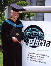 That changed on July 7, when 21 students walked across a stage in Hannover, Germany, and received master's degrees in industrial administration from the Krannert Graduate School of Management at Purdue University. It was a fitting celebration of the completion of the first year of Purdue's five-year contract with a German foundation to establish the German International Graduate School of Management and Administration (GISMA). One of the early and strong supporters of GISMA was Gerhard Shroeder, then prime minister of Niedersachsen, now chancellor of Germany. It was announced at a news conference in conjunction with the graduation ceremonies that the state of Niedersachsen will match contributions to GISMA up to 25 million Deutschmarks over the next five years. Faculty members from Purdue's Krannert Graduate School of Management have logged lots of frequent-flier miles traveling from the West Lafayette campus to teach eight-week "modules" of practical, case-study oriented, American MBA fare in lower Saxony. "We do everything at GISMA that we do back on the Purdue campus, but we do it in an international context," GISMA dean and long-time Krannert faculty member Dan Schendel says. "While other stateside schools have weekend and summer business programs, GISMA's first class graduated from the first full-time, American-style MBA program in Europe. GISMA is an international school whose common language is English." German and international students from GISMA have spent time at Krannert and six American Krannert students, who had been studying in Hannover, stuck around for the graduation ceremonies of the first class. Speaking at the graduation ceremonies was Heinrich von Pierer, CEO of Siemens, the 440,000-employee worldwide electrical engineering and electronics company. Representing Germany were Sigmar Gabriel, the prime minister of Niedersachsen (Lower Saxony, Hannover's state), and Klaus Stuhr, a founding father of GISMA and the CEO of the GISMA Foundation. Sharing the stage was Juergen Grossman, CEO of the German steel-making company Georgesmarienhutte Gmbh. Grossman is a Krannert Graduate School of Management alumnus who was instrumental in the establishment of GISMA and remains active in its growth and governance. Also on hand were Purdue President Steven C. Beering, Krannert Dean Richard A. Cosier, Schendel, and Gerald J. Lynch, GISMA associate dean. Purdue isn't alone in overseas MBA programming. A who's who of American universities Harvard, Northwestern, Duke, Chicago and Michigan have established international educational beachheads not only in Europe but also in Asia and Latin America. The Purdue-German partnership offers both residential and executive MBA options, aims for an international student body that is one-half German and one-half from other nations, and incorporates interchanges of students and faculty on the West Lafayette and Hannover campuses. GISMA's first five years of operation are funded by a $27 million contract provided to Purdue by a foundation supported by German corporations. Twelve members of the first graduating class are German citizens. Students also hail from Canada, China, England, Estonia, Greece, India, Mexico and Turkey. All of the members of the class have at least one job offer. One of the graduating students, Ingo Marxsen, is a graduate of a German business school, the University of Erlangen in Nuremberg. After completing his first semester in Hannover, Marxsen spent January and February as an exchange student on Purdue's West Lafayette campus. Marxsen says the practical, case-study approach in American graduate business education differs profoundly from the classical model that is the standard at European universities. "The sheer quantity of the work required makes for a great deal of pressure," Marxsen says of his American-style business school experience. "They told us when we started that there was so much work that we'd have to team up to do it." The four- to six-student project teams get one grade, he explains. The deadlines are much more stringent than those of his German university. And the whole experience is as competitive as the slim, fair-haired tennis enthusiast could want. "You win together and lose together," Marxsen says. "If there are people on the team who aren't contributing, you have to figure out how to motivate them." He acknowledges that this part of his educational experience is a very short distance from what he terms "real work." There is also more work to do to establish the MBA degree in Germany. "The heads of German corporations will have to see results before they don't think you are talking about the National Basketball Association when you say 'MBA,'" Marxsen says. Schendel says he is confident in the long-term prospects for the MBA in Germany. "While Purdue professors are teaching the classes for the first five years of the program, in 10 years we will have built a resident faculty and made this a self-standing school." Sources: Dan Schendel, (765) 494-4386, schendel@mgmt.purdue.edu Ingo Marxsen, 00490 - (0) 171 - 440 60 57, ingo@marxsen.de Writer: Mike Lillich; (765) 494-7676; mlillich@purdue.edu Purdue News Service: (765) 494-2096; purduenews@purdue.edu PHOTO CAPTION: Kirsten Meyerhoff of Gremany is one of the 21 master's degree graduates of the inaugural class of the German International Graduate School of Management and Administration. The graduates' degrees are from Purdue University's Krannert Graduate School of Management, which has a five-year contract to set up the first full-time, American-style MBA program in Europe. (Photo courtesy Tim Newton.) A publication-quality photograph is available at the News Service Web site and at the ftp site. Photo ID: Schendel.gisma