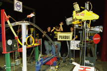 The contest, which is free and open to the public, begins at 11:30 a.m. in Purdue's Elliott Hall of Music. Students build their machines by combining the principles of physics and engineering with common objects, such as golf balls, mouse traps, bicycle gears, children's toys, rubber tubing and an abundance of duct tape. The event honors the late cartoonist Rube Goldberg, who specialized in drawing whimsical machines with complex mechanisms to perform simple tasks. Purdue's entry was chosen in February at a local contest. Using materials that could have come from their childhood toy boxes and Dad's workshop, a team of seven members of the student chapter of the Society of Manufacturing Engineers earned top honors with a machine based on the theme "Planes, Trains and Automobiles." It used 26 complex steps and all manner of toy vehicles to turn off an alarm clock with no human intervention and within a time limit. Each machine must run, be reset and run again in nine minutes. Points are taken off if students have to assist the machine once it's started. The teams also will be judged and awarded points based on the creative use of materials and use of related themes. Last year's national winner was the "Rube Goldberg Pit Crew" from the University of Texas at Austin. The team's machine took 35 steps and about a minute and a half to load a CD into a player and play it. In addition to cash prizes for the top three teams, a "People's Choice" award will be given to the team whose machine gets the most votes from audience members. Student organizers of the contest maintain a World Wide Web page at https://expert.cc.purdue.edu/~thetatau/RUBE/ CONTACT: Chad Goze, contest chairman, (765) 743-2461; e-mail, goze@purdue.edu
