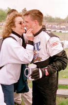 I'M SO PROUD -- Nancy Smith congratulates her son, Kyle, after he won the 41st running of the Purdue Grand Prix. Smith, Frankfort, jumped out the lead in the first turn and led the entire race. He is a junior in the Schools of Engineering. (Photo by