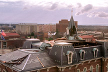 High winds Sunday evening (12/6) stripped away about one-quarter of the building's roof and damaged the cupola. A broken water-sprinkler pipe caused water damage throughout the building. Physical facilities staff initially thought the cupola would have to be removed for permanent repairs, but further inspection showed that the work could be done with the unique structure in place. Classes and final exams scheduled for the building's 16 classrooms were reassigned to other facilities after the wind damage. Faculty and staff with offices in University Hall were able to return to the building Wednesday (12/9). Classrooms will reopen Jan. 11 at the start of the spring semester. University Hall, completed in 1877, is the oldest surviving building on the West Lafayette campus. The Victorian-style, spired building overlooks Memorial Mall and the gravesite of the university's founding benefactor, John Purdue. In addition to classrooms, the building houses the Department of History.