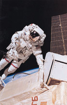 At Johnson Space Center, Amy Ross (BSME '94, MSME '96), Jerry's daughter, relaxed, if only a bit. "Before the Endeavour launched, I told Dad that I wanted to hear glove comments," she says. "I'm the lead NASA spacesuit glove engineer. It's my responsiblity to make sure that the gloves are being designed and manufactured and fit properly for the astronauts." Amy led the design of NASA's Phase VI gloves,which Jerry tested on the mission. "We worked right up to the end to get a good fit." After completing the basic design, the engineers working on the Phase VI gloves took a mold of Jerry Ross's hand, got computer data from it, and started building up a model of the hand. Then patterns were made and the gloves fabricated.