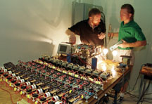 PHOTO CAPTION: Scott Sudhoff, left, and research engineer Steve Glover work on a solid-state transformer. High voltage, roughly 7.2 kilovolts, comes in at the bottom of the picture and is converted to the 120-volt household current needed to run the light bulbs at the opposite end of the table. (Purdue News Service photo by David Umberger) Color photo, electronic transmission, and Web and ftp download available. Photo ID: Sudhoff.transformers