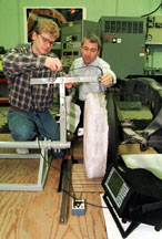 Purdue News Service: (765) 494-2096; purduenews@purdue.edu CAPTION: Jacob Klos, left, a Purdue graduate student in mechanical engineering, and Bob Bernhard, an engineering professor and director of the university's Institute of Safe, Quiet and Durable Highways, use a laser to study how noise is generated by a smooth tire on a textured surface. The tire, painted white to better reflect laser light, is rotated on a motor-driven roller. The laser measures vibration, and the data are relayed to a "signal analyzer" for interpretation. (Purdue News Service Photo by David Umberger) Color photo, electronic transmission, and Web and ftp download available. Photo ID: Bernhard.roads