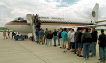 Purdue News Service: (765) 494-2096; purduenews@purdue.edu PHOTO CAPTION: Purdue students line up for a good look at the aviation technology department's newest laboratory, a retired Boeing 737 aircraft donated by United Airlines. The plane arrived in West Lafayette on May 8 and was dedicated today (Friday, Sept. 10) for educational use. (Purdue News Service Photo by David Umberger) A publication-quality, downloadable photo is available at the News Service Web site and at the ftp site. Photo ID: Kroes.newplane