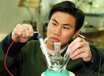 "It has a huge amount of energy potential," says John Rusek, an assistant professor of aeronautics and astronautics at Purdue University, who is working with students to develop the cell. A poster paper about the research was presented in November, during the Second International Hydrogen Peroxide Propulsion Conference at Purdue. Hydrogen peroxide, or H2O2, also offers promise in developing low-cost, nontoxic rocket fuels. The chemical differs from water only in that it contains two oxygen atoms. It is relatively easy to manufacture in principle it could be made from water and it is far less dangerous or expensive than conventional "oxidizers," such as liquid oxygen, which are needed to burn rocket fuels. "It is actively being studied together with new types of nontoxic propellants made from alcohol that offer promise as alternatives to the conventional petroleum-based rocket fuels," Rusek says. Engineers hope to have hydrogen-peroxide-based rockets in operation within a decade. But at least one visionary couldn't wait that long. Richard Brown, a British engineer, became the fastest man on two wheels in September, when his Gillette Mach 3 Challenger rocket-powered motorcycle hit 365 miles per hour at the Bonneville Salt Flats. "All I can say is the G force is absolutely obscene," Brown, 34, told researchers during the hydrogen peroxide conference. The 26-foot-long vehicle was powered by rockets that used hydrogen peroxide as an oxidizer. Unlike the hydrogen peroxide that is found in drugstores, which is about 97 percent water, the rocket-propulsion variety has just the opposite concentration 3 percent water and 97 percent hydrogen peroxide and it has had critical contaminants removed, says Stephen Heister, a professor of aeronautics and astronautics at Purdue. This purified, concentrated form of H2O2 is then broken down with chemical catalysts, yielding oxygen that combusts with alcohol-based fuels, such as methanol or ethanol, which can be derived from corn. Such a propulsion system would provide an alternative to today's nonrenewable hydrocarbon fuels that are processed from crude oil, Heister says. In the fuel cells, hydrogen peroxide serves two roles: it is a "catholyte," meaning it is both the electrolyte a liquid that conducts electricity and allows the reaction to occur and it is the cathode, or the portion of the battery that attracts electrons. The aluminum serves as the cell's fuel and its anode; as it oxidizes, it gives up electrons. Waste products include water and recyclable chemical compounds. Serendipity has helped the Purdue researchers overcome a major obstacle in the fuel cell work. Earlier attempts by the U.S. Navy to develop the cells were abandoned because the reaction with aluminum quickly formed a thick sludge that hindered the flow of electricity. However, because the Purdue engineers didn't have pure aluminum for their work, they used an aluminum alloy. To their surprise, they found that the alloy did not form the sludge, Rusek says. One problem with the experimental cells is that, unlike batteries, they do not immediately provide a steady supply of electricity; it takes about two hours for the cells to reach their peak electrical output before producing a steady current flow, says engineering student Kok Hong Lim, a junior from Singapore who is majoring in aeronautics and astronautics. Future work will include research aimed at correcting that problem, he says. Aluminum was chosen originally because it is an abundant natural resource and is readily available from recycled sources, says Rusek, who estimates that the cells are at least 20 times higher in energy density than a standard lead-acid car battery. "That means a 20-kilogram lead-acid battery would put out the same amount of energy as a one-kilogram hydrogen peroxide fuel cell," he says, noting that other metals, such as lithium alloys, might also work in hydrogen peroxide fuel cells. Sources: John Rusek, (765) 494-4782, rusek@ecn.purdue.edu Stephen Heister, (765) 494-5126, heister@ecn.purdue.edu Writer: Emil Venere, (765) 494-4709, emil_venere@purdue.edu Purdue News Service: (765) 494-2096; purduenews@purdue.edu PHOTO CAPTION: Purdue engineering student Kok Hong Lim, a junior from Singapore, attaches leads to an experimental hydrogen peroxide fuel cell that researchers think may one day replace conventional batteries. (Purdue News Service Photo by David Umberger.)
