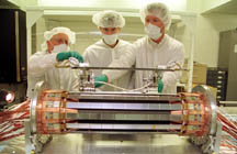 "The big question is, how did the universe survive?" says Ian Shipsey, a professor of physics at Purdue. "If matter and antimatter were created in equal quantities in the early universe, each antiparticle would have annihilated a particle, and the universe, as we know it, would have ceased to exist." But the universe does not contain equal amounts of matter and antimatter; it is predominantly made of matter. A possible solution to the problem is that there are small differences in the properties of antimatter and matter, setting in motion an evolutionary process that, over billions of years, has resulted in today's matter-dominated universe. The best way to test this theory is to analyze subatomic particles referred to as bottom quarks, also known as beauty quarks, which a silicon detector being built at Purdue is designed to do. The detector, called Si3, is part of an overall experiment called CLEO III. It contains 450,000 silicon strips, or "cameras," each about the width of a human hair. The cameras detect the life and death of quarks, which are created when matter and antimatter collide. The tiny silicon strips are attached to 125,000 channels of sensitive electronics, arranged in four concentric cylinders and held in place by an elaborate tripod-like framework made of synthetic diamond and copper. Shipsey heads the detector work, which involves four universities. The Si3, which is about 21 inches long, was shipped early this month to Cornell University, where it will be connected to other detectors in the CLEO III experiment, an international collaboration of about 20 universities. Once considered strictly theoretical, antimatter has been steadily emerging into the world of reality. Particles of antimatter look and behave the same as ordinary subatomic particles. But although they have the same mass as their matter counterparts, they have the opposite electrical charge. If particles and antiparticles meet, they instantly annihilate each other, releasing a large amount of energy in the process. Physicists use particle accelerators to produce antiparticles. At Cornell's Wilson Synchrotron Laboratory, electrons and their antimatter counterparts, positrons, are smashed together in an underground particle accelerator. As they collide, the particles annihilate, producing constituent particles whose properties must be precisely measured to further understand the nature of matter. Various detectors are located at specific distances and positions from the point of collision. As the newly created particles speed away, they penetrate the silicon in the Si3 detector, which sends signals to a computer detailing the precise positions of the particles. The combined signals from all the detectors in CLEO III will be used to measure data such as momentum, velocity, energy and penetrating power of particles produced in collisions. Those data will then be used to test the widely accepted "standard model" of physics, which states that matter is made of 12 fundamental building blocks. The theory says that all matter consists of six varieties of leptons, a family that includes electrons, and six varieties of quarks. The quarks are grouped into three sets of "twins": the up and down, the strange and charm, and the top and bottom. The quarks are held together by particles called gluons. For example, a proton is made of two up quarks and one down quark, bound together by gluons. However, more precise information is needed to explain why this structure exists and to solve the matter-antimatter mystery. High-energy collisions at particle accelerators mimic conditions that existed in the early cosmos, yielding data critical to the research. Source: Ian Shipsey, (765) 494-5390, shipsey@physics.purdue.edu Writer: Emil Venere, (765) 494-4709, emil_venere@purdue.edu Purdue News Service: (765) 494-2096; purduenews@purdue.edu PHOTO CAPTION: Technician Tom Smith, Purdue physicist Ian Shipsey and mechanical engineer Kirk Arndt, (left to right) work on a silicon detector, which will become part of the CLEO III physics experiment operated at Cornell University, where electrons and their antimatter counterparts, positrons, are smashed together in an underground particle accelerator.