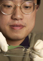 "This development democratizes the preparation of microfluidic biochips," said Michael Ladisch, Distinguished Professor of Agricultural and Biological Engineering and Biomedical Engineering. "This brings the design and manufacture of these devices within reach of scientists in many laboratories who can now easily test their ideas and conduct research within a typical laboratory setting." Microfluidics is a branch of nanotechnology that involves manipulating minute quantities of liquids, typically in a chip device approximately the size of a postage stamp. The initial design and manufacture of these chips often requires weeks of work, but the new approach developed by Ladisch and Tom Huang, a graduate student in chemical engineering, cuts that time to hours. Microchips have traditionally been made through a lengthy and expensive process called photolithography, which uses X-rays or ultraviolet light to form a pattern on a glass or silicon wafer that is then etched by washing the wafer with a variety of solvents. The key to controlling the shape and size of the patterns on the wafer is the production of a template, which can take weeks to develop. Ladisch and his team have developed an alternative method that uses materials easily acquired by any research laboratory, including glass microscope slides, tweezers, thin glass fibers such as those found in glass wall insulation, and a flexible polymer called PDMS that is available from most scientific supply companies. "What we've done is really thinking outside of the box," said Nate Mosier, an assistant professor of agricultural and biological engineering who also contributed to this project. "This is a radical departure from using photolithography to make these devices." The speed and simplicity of Ladisch's method gives researchers the flexibility to experiment with the conception and construction of microchips that can test any number of ideas. "This whole device can be developed and in operation in less than two hours," Ladisch said. "Tools like this that take a lot less time to make and that can be manufactured in any lab are going to speed up the rate of research." Mosier said, "The capability for rapid prototyping and working out design considerations before the manufacturing step is important to any development, from the micro-scale on up. "It's always very difficult to the make the first of anything -- the second through the millionth are much easier." The new chip assembly method involves placing a fine fiber - approximately one-tenth the width of a human hair - on a glass slide and covering it with a small square of the polymer PDMS. The polymer flexes slightly over the fiber, creating a small channel on either side of the fiber, much the same way that a sheet of plastic wrap placed on top of a pencil would bend, making two channels running the pencil's length. A small amount of pressure applied with a finger is enough to cause the PDMS to stick to the glass slide, Mosier said. "The chemical properties of the PDMS allow it to stick to the glass slide with enough strength to form a tight seal, which permits us to pump liquids through the channel," Ladisch said. In addition, he said, the small size of the channel - not quite the width of a strand of hair - allows researchers to minimize their use of experimental liquids, which may be costly or difficult to obtain. In their proof-of-concept paper, published in the November issue of the American Institute of Chemical Engineers Journal, the team showed that coating the fibers with materials that attract different types of molecules allowed them to separate specific proteins from a mixed solution. By manipulating the fiber's properties, scientists can identify or separate various types of molecules, such as proteins or antibodies, from solutions pumped through the chip. Depending on the properties of the fiber, liquids placed at one end of the channel move through the device by "wicking" along the fiber, or by being pulled through by with a weak vacuum at the opposite end of the channel. "We can control the chemistry inside the channel to determine what flows through, what sticks, and in that way we can separate things out," Huang said. This ability translates into numerous potential applications, such as the ability to diagnose diseases or detect foodborne pathogens and biological agents. "These kinds of chips are essential from a security perspective," said Bob Armstrong, senior research fellow at the National Defense University, one of the organizations that funded this research. "Microfluidic chips are becoming part of a sensor system to detect, for example, biological or chemical agents, or pathogens in the food supply. What is it you want to detect? Your imagination is the only limit on how to use these devices." Also collaborating on this research were Woo-Jin Chang, research associate in electrical and computer engineering; Demir Akin, senior research scientist in electrical and computer engineering; Rafel Gomez, former graduate student in electrical and chemical engineering; and Rashid Bashir, associate professor of electrical and computer engineering and biomedical engineering. The research is part of an ongoing project sponsored through the Purdue Center for Food Safety Engineering and the Purdue Laboratory of Renewable Resources Engineering. Funding was provided by the Agricultural Research Service of the U.S. Department of Agriculture, and the Center for Technology and National Security Policy at the National Defense University in Washington, D.C., is contributing to the further development of this concept. Writer: Jennifer Cutraro, (765)496-2050 Sources: Mike Ladisch, (765)494-702 , ladisch@purdue.edu Nate Mosier, (765)494-6695, mosiern@purdue.edu Tom Huang, (765)494-0326, huangt@purdue.edu Bob Armstrong, (202) 685-2532, armstrongre@ndu.edu Ag Communications: (765) 494-2722; Beth Forbes, bforbes@aes.purdue.edu