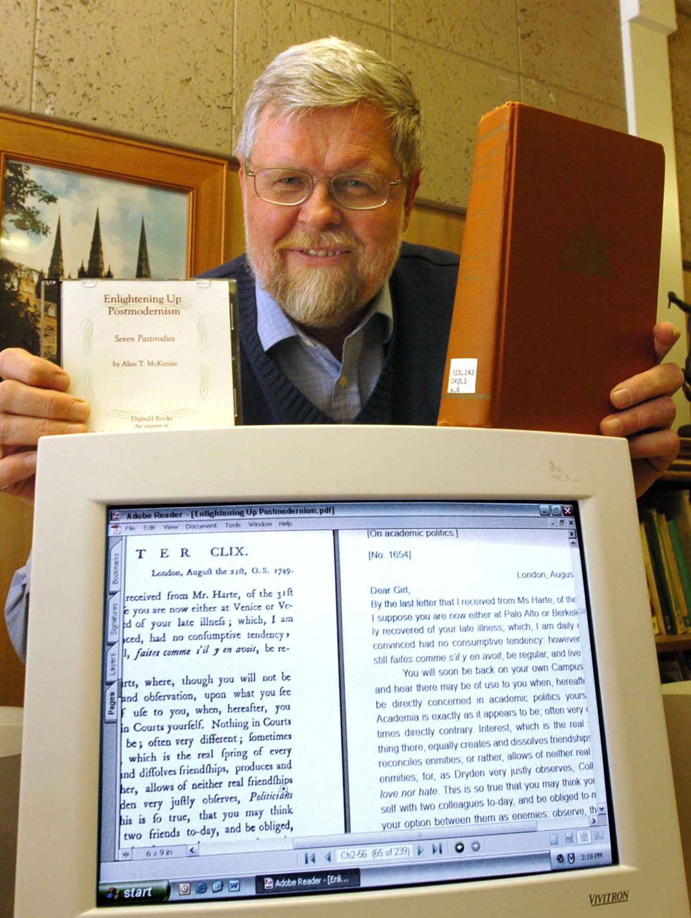 A Purdue University expert in British literature puts words into the mouths of some of the century's key literary figures, such as Samuel Johnson and Lord Chesterfield, in "Enlightening Up Postmodernism: Seven Pastirodies." "Pastirodies," a word that was coined by McKenzie, means part pastiche and part parody. The e-book ($24.95) is available this month from the Purdue University Press. Purdue's e-books, known as Digital-I books, are published in a digital format, and no paper copies exist. This book is believed to be the first digital book in literary criticism. "Some may consider my topic, or even the format, academic mischief, but my work is not just a stylistic ploy or academic prank," says Alan T. McKenzie, professor of English in Purdue's School of Liberal Arts. "My approach to using this technology will encourage scholars in the field to revisit great literary criticism and introduce new readers, who undoubtedly will benefit from the digital resources, such as hyperlinks, for some of these great readings." Many books have been scanned into an electronic format for readers to access on their computers, but this book was conceptualized to exist only digitally. McKenzie wrote the book for a digital format because most of the chapters display the 18th century original text on the left side of the screen and McKenzie's version on the right. The reader can cross-reference both texts on the same computer screen. Hyperlinks also are embedded in the text so the reader can access footnotes, illustrations and other chapters. Digital e-books are starting to emerge from university presses, according to the Association of American University Presses, but there is still some skepticism about this new publication format, says Rosemary Feal, executive director of the Modern Language Association. But despite some scholars' hesitations, there are a growing number of high-profile academic endeavors, such as the Gutenberg-e project turning history manuscripts into e-publications that have more scholars pursuing multimedia options. "I understand that Purdue's press followed the same rigorous peer review process in evaluating this work as it would with any other scholarly book," Feal says. "With time, and with more successful examples, this format will gain acceptance as the academic community realizes the possibilities it offers to all those involved in the production, distribution and preservation of scholarship." In his book, McKenzie twists Lord Chesterfield's letters to his illegitimate son into "Lord Chesterfields Letters to his Daughter on the Tenure Track." Instead of sharing advice about achieving success in the 18th century, he offers similar advice for succeeding at a modern university. In today's version, the father warns his daughter that rock concerts and roller blades can tempt a young scholar to neglect her university studies. In "Johnson's Life of Foucault," McKenzie writes about Michel Foucault, the 20th century philosopher, as Johnson, 18th century editor and author, would have written if he hadn't died two centuries earlier. Funding for McKenzie's research is from the Department of English and the School of Liberal Arts' Center for Humanistic Studies. McKenzie also has written "Certain, Lively Episodes: The Articulation of Passion in Augustan Prose" and "Sent As A Gift: Eight Correspondences from the Eighteenth Century." To order the book visit the Purdue Univerisity Press web page, or call (800) 247-6553. Writer: Amy Patterson-Neubert, (765) 494-9723, apatterson@purdue.edu Sources: Alan McKenzie, (765) 494-3740, amckenzie@sla.purdue.edu Thomas Bacher, director of Purdue University Press, (765) 494-8251, bacher@purdue.edu Rosemary Feal, (646) 576-5000, rfeal@mla.org Purdue News Service: (765) 494-2096; purduenews@purdue.edu Note to Journalists: Journalists interested in acquiring a review copy of "Enlightening Up Postmodernism: Seven Pastirodies" should contact Thomas Bacher, director of Purdue University Press, by email at bacher@purdue.edu, or fax (765) 496-2442. PHOTO CAPTION: A publication-quality photo of Alan McKenzie is available at https://ftp.purdue.edu/pub/uns/+2004/mckenzie-books.jpg