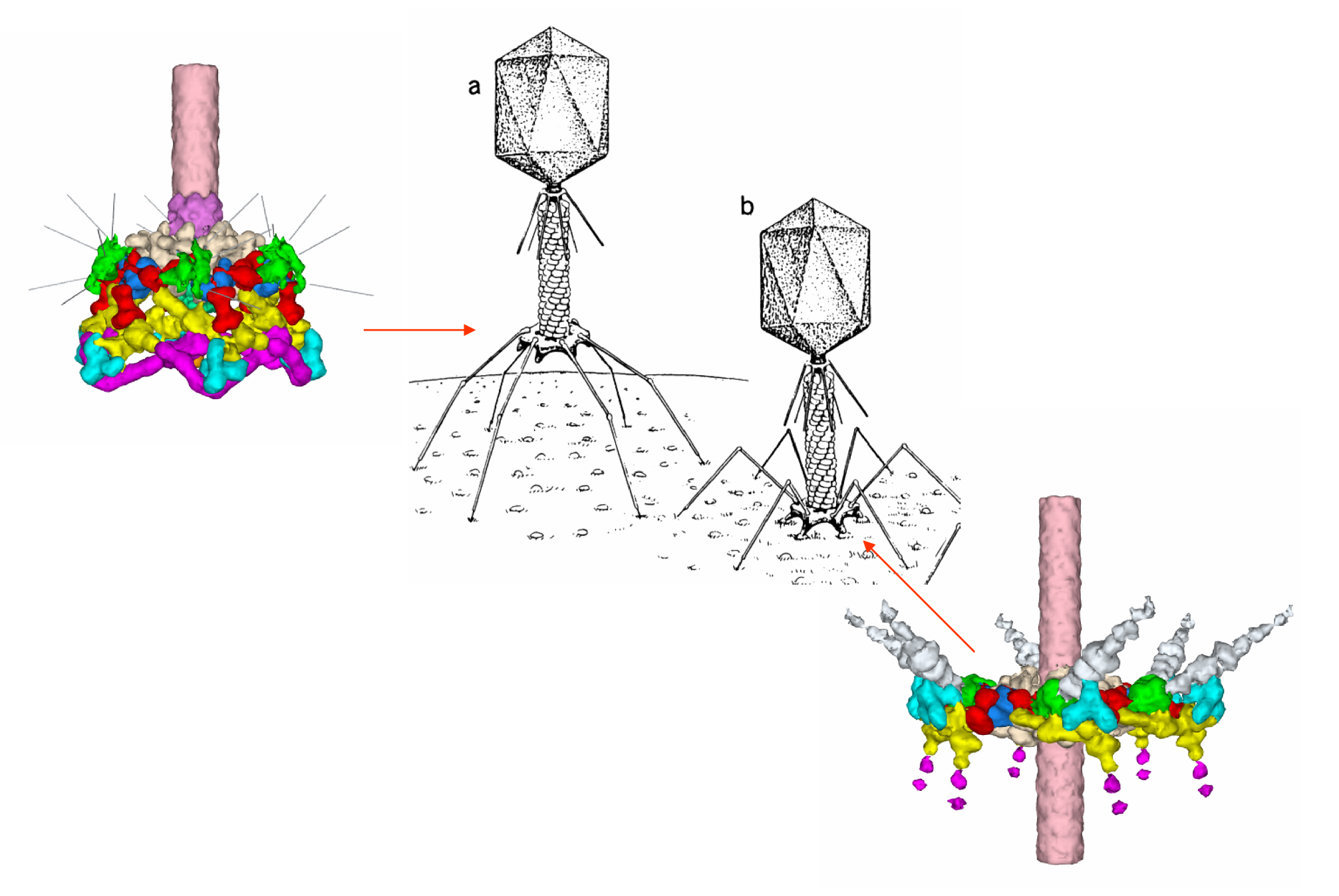 GRAPHIC CAPTION: A publication-quality graphic is available at https://ftp.purdue.edu/pub/uns/+2004/rossmann-baseplate.jpg GRAPHIC CAPTION: The T4 virus is shown here in black and white at two moments in its life cycle, both before and after a portion of its midsection, called the baseplate, undergoes the conformational change necessary for the virus to infect the E. coli bacteria on which it rests. On either side of these images are color close-ups of the baseplate, both before the change (at left) and afterward (at right). By following the changes in T4, Purdue researchers hope to gain insight into the infection process, work which could lead to deeper understanding of how other viruses infect host cells. (Purdue University graphic/Michael G. Rossmann laboratory and associates) A publication-quality graphic is available at https://ftp.purdue.edu/pub/uns/+2004/rossmann-baseplate2.jpg Three-dimensional Rearrangement of Proteins in the Tail of Bacteriophage T4 on Infection of its Host The contractile tail of bacteriophage T4 undergoes major structural transitions when the virus attaches to the host cell surface. The baseplate at the distal end of the tail changes from a hexagonal to a star shape. This causes the sheath around the tail tube to contract and the tail tube to protrude from the baseplate and pierce the outer cell membrane and the cell wall, before reaching the inner cell membrane for subsequent viral DNA injection. Analogously, the T4 tail can be contracted by treatment with 3 M urea. The structure of the T4 contracted tail, including the head-tail joining region, has been determined by cryoelectron microscopy to 17 Å resolution. This 1200 Å-long, 20 Mda structure has been interpreted in terms of multiple copies of its approximately 20 component proteins. A comparison with the metastable hexagonal baseplate of the mature virus shows that the baseplate proteins move as rigid bodies relative to each other during the structural change.