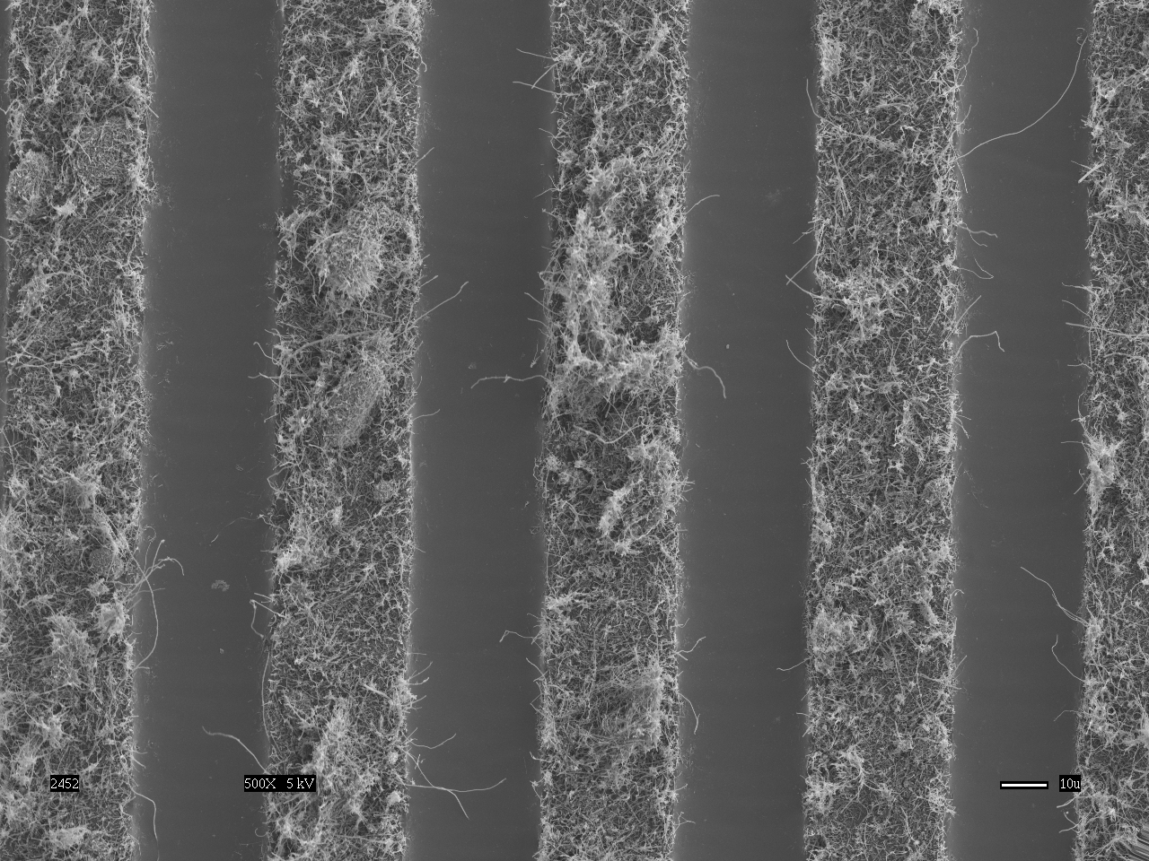 Osteoblasts Aligned with Carbon Nanotubes/Nanofibers In this work, we describe the first successful alignment of osteoblasts (bone-forming cells) on aligned carbon nanofiber/nanotube arrays in either a polymer matrix or SiO2 substrate. To align carbon nanofibers (CNFs) on a polymer matrix, we developed a novel imprinting method. In addition, the surface-templated assembly method was used to prepare aligned single-wall carbon nanotube (swCNT) arrays on a SiO2 substrate. On both substrates, results demonstrated that aligned carbon nanofiber/nanotube arrays can be used to direct osteoblast morphology important for the continued development of a novel biocompatible substrate with potential for regenerating bone.