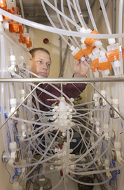 "Replication is important to test abatement technology," said Heber, who has one of only six laboratories in the country that studies emissions connected with odor. "If you want to modify a diet, then we want to know if the new diet will affect emissions from a pig. To do this, you need at least two rooms with the new diet and two rooms with the old diet. This building allows proper replication." Emissions of animal waste-caused pollutants that emanate from livestock facilities include particulate matter, ammonia, hydrogen sulfide, methane, carbon dioxide and nitrous oxide, which is a byproduct of ammonia. The latter three are considered greenhouse gases, which are at least partially responsible for global climate changes. Monitoring of emissions at the Purdue swine research facility is performed unmanned around the clock. Samples of gas are picked up at 25 places in the barn using a new $50,000 device, purchased through a USDA grant, that measures ammonia and greenhouse gases. Although the EPA doesn't regulate odors, it does restrict emission amounts of odor-causing chemicals. Any facility emitting more than 100 pounds per day of either or both hydrogen sulfide and ammonia must report it to the EPA. The fine for exceeding this amount is $27,000 per day. Approximately 3,500 pigs can generate 100 pounds of ammonia per day, Heber said. Though he uses sophisticated methods for sampling and measuring the chemicals that create odor, Heber uses the human nose to determine the nuisance factor. The researchers bag the odor and then take the bags to campus where eight panelists each take a whiff. A $30,000 ofactometer dilutes the odor in the bag with odor-free air in order to determine how much smell is offensive. "We determine each panelist's odor threshold." Heber said. "For example, in some cases we might have to dilute the odor 500 times before they can't smell it. For another person it might be 1,000 times." Complaints from private citizens and municipalities, including several lawsuits against livestock farms, led to calls for setting emission standards and for methods to efficiently measure waste, odor and other pollutants, Heber said. Richert, Heber and their research teams are delving into the best ways to mitigate emission problems. "There are several ways to measure ammonia, and we are using top-of-the-line, EPA-approved instruments that use a chemiluminescence method that mixes nitrous oxide with ozone to create a glow," Heber said. "We also use an infrared method and similar methods for hydrogen sulfide." The 12 identical rooms at the facility house hogs that can be fed diets with varying ingredients. Different recipes can contribute to varying amounts of manure, urine, the various resulting chemicals and gases, and also animal growth. Airflow in the barn research rooms is controlled and management of animal waste is varied to determine how various practices impact emissions into air and water. The temperature is controlled in a way as similar to an average large livestock barn as possible. "The fans are computer controlled, so we know exactly the fan and the air exchange rates. Then we can sample the gases and determine exact emission rates for any compound we're monitoring," Richert said. "We've mimicked exactly what the industry has today, so we think we'll have the best data available." The location of the barns - whether in a valley or on a hill or surrounded by trees or entirely out in the open - also must be considered when determining the effect of the particulate matter, chemical and/or odor a livestock facility is ultimately emitting, Richert and Heber said. The method used and how often livestock waste is disposed of also plays a part in air emissions and water pollution. "All those things come into play," Richert said. "If a facility ventilated by fans has a tree line, a tree line can deflect everything up and dilute it. If there is no tree line, the fans can blow directly across a field or a road and the neighbors will smell it." Combining all of the data from the research barn and from the bags gives the scientists ways to calculate how far away a livestock facility must be from a neighbor to minimize the odor, and also helps adjust management and feed practices to negate the facility's environmental impact, Heber said. "We are addressing the odor nuisance problem, and this building allows us to measure odor concentration directly," he said. "If we know the odor concentration and the airflow through the fan, we can calculate the odor emissions. So we very carefully measure both the concentration of the pollutant in the air going out of the building and the air flow in the barn. "We're establishing and refining methods and techniques that are being used around the country. Hopefully our measurement protocol will become the official EPA standard." Although the Purdue Swine Environmental Research Building will be dealing only with pigs over the next two or three years, results may help cope with other livestock issues, and the facility itself someday may host studies on other farm animals, Richert said. The current projects to study the impact of diet on odor, excretion and air emission, and to establish baseline emission data for swine facilities, are funded by USDA and EPA grants totaling $500,000 and another grant from the USDA's Animal and Plant Health Inspection Service for $1.3 million. Writer: Susan A. Steeves, (765) 496-7481, ssteeves@purdue.edu Sources: Brian Richert, (765) 494-4837, brichert@purdue.edu Albert Heber, (765) 494-1214, heber@purdue.edu Ag Communications: (765) 494-2722; Beth Forbes, forbes@purdue.edu