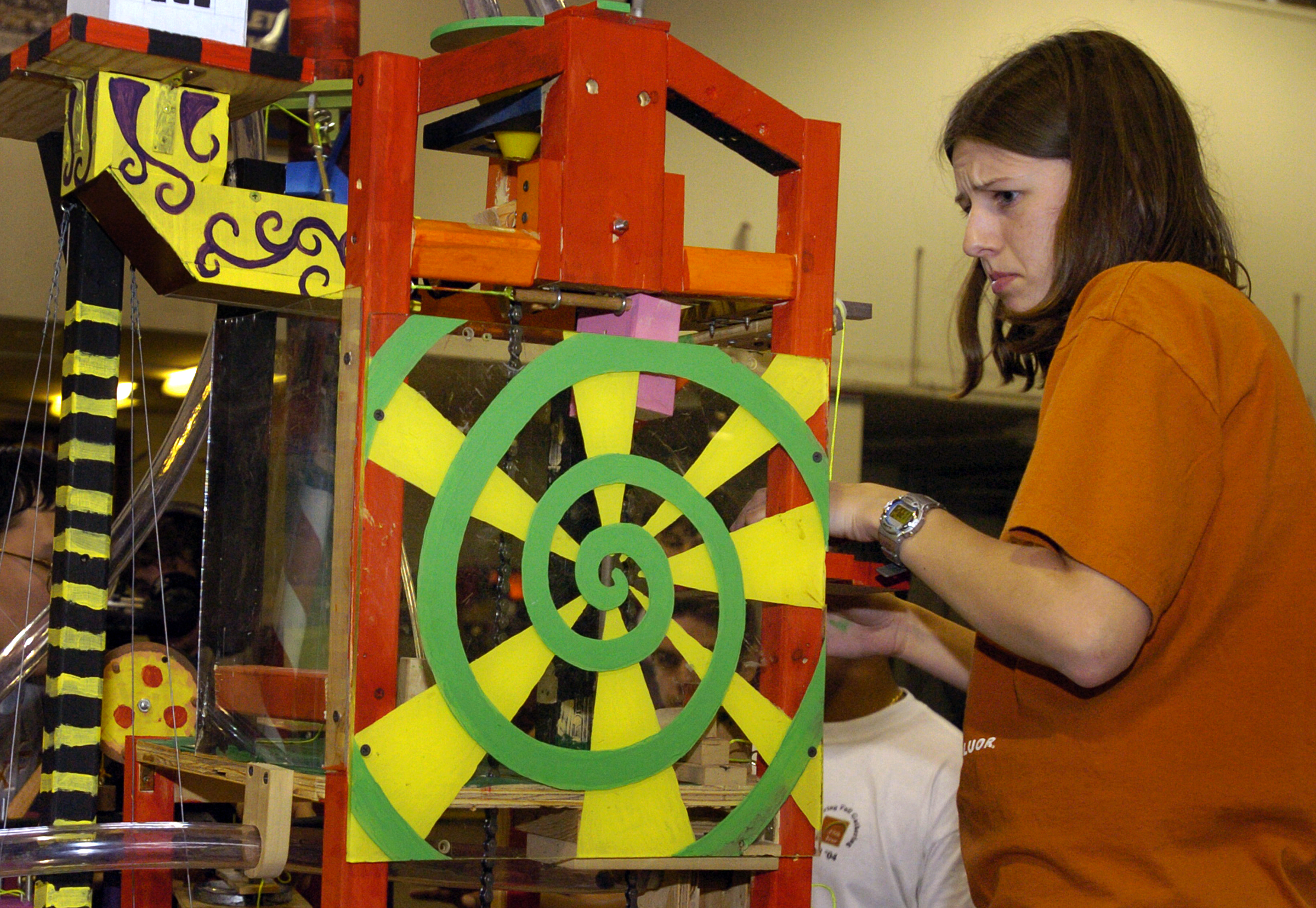 Using steps that included launching a toy rocket and a rotating auger, the Purdue Society of Professional Engineers beat teams from six other universities to capture the national crown in complexity and inefficiency. Teams in the competition, which took place in the Purdue Armory on the university's West Lafayette, Ind., campus, had to create machines that would replace batteries in a flashlight and turn it on using a minimum of 20 steps that employed principles of engineering and physics. While all of the teams used more than required, the winning machine's 125 steps were by far the most. "We are all engineering and technology students, and this machine ties together everything we have learned in our classes," said co-captain Shawn Jordan, a graduate student in computer engineering from Fort Wayne, Ind. "It serves as a giant interdisciplinary design project that everyone on the team brings a different background and perspective to." The group also won the event's People's Choice Award, which was voted on by the more than 400 audience members. A team from Ferris State University came in second with a carnival-themed machine, and the University of Texas at Austin placed third.
