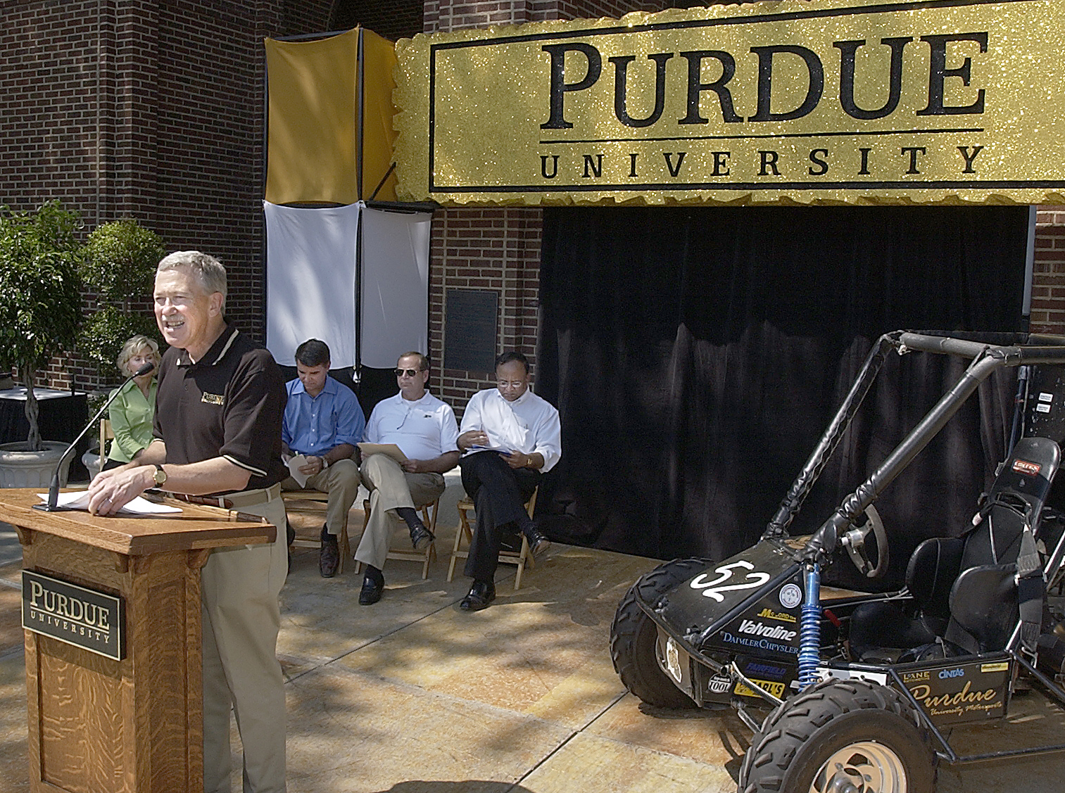 PHOTO CAPTION: Purdue President Martin C. Jischke today (Wednesday, Aug. 17) announces the creation of the universityÕs Energy Center during Purdue Day at the Indiana State Fair. Attending the event were, in background from left, Lt. Gov. Becky Skillman; Charles Conner, deputy secretary of the U.S. Department of Agriculture; Alan Rebar, interim executive director of Discovery Park; and Jay Gore, the Vincent P. Reilly Professor in Mechanical Engineering and interim director of the Energy Center. The center, which will be located in Discovery Park, will research various forms of energy, such as ethanol, nuclear, clean coal, solar and wind turbine, to help America become energy independent. It was initially funded by a grant from Lilly Endowment and recently received $85 million in federal funding to be shared with similar energy centers in Illinois and Kentucky. (Purdue University photo/Tom Campbell)A publication-quality photo is available at https://www.purdue.edu/uns/images/+2005/jischke-fairenergy.jpg PHOTO CAPTION: From left, Scott Meyer, a senior propulsion engineer, helps Cyril Jos, a master's degree student in aeronautical and astronautical engineering, make final adjustments on a 1,000-pound thrust rocket-based cycle engine at Purdue University's Maurice J. Zucrow Laboratories. The research is part of Discovery Park's new Energy Center, which will develop economical and environmentally sound energy sources. The rocket in this technology includes a more efficient engine that uses oxygen from the atmosphere instead of oxygen carried on board the vehicle. (Purdue News Service photo/David Umberger)A publication-quality photo is available at https://www.purdue.edu/uns/images/+2005/gore-rocket.jpg PHOTO CAPTION: A publication-quality photo is available at https://www.purdue.edu/uns/images/+2005/ho-energy.jpg PHOTO CAPTION: A publication-quality photo is available at https://www.purdue.edu/uns/images/+2005/gore-rocketcontrol.jpg PHOTO CAPTION: A publication-quality photo is available at https://www.purdue.edu/uns/images/+2005/choi-lab.jpg
