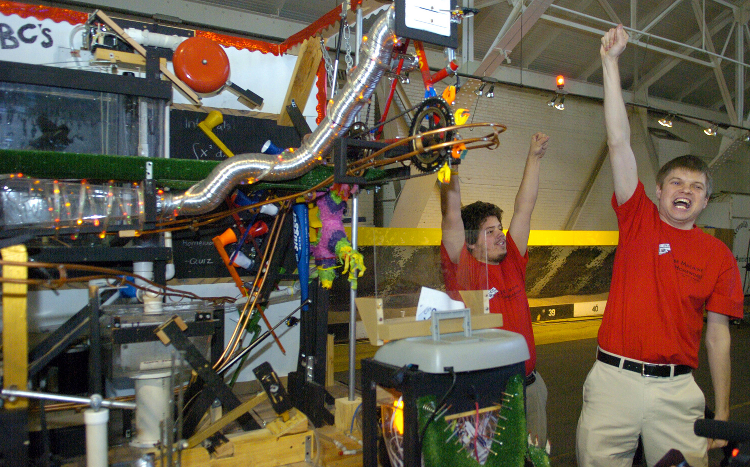 PHOTO CAPTION: Shawn Jordan, a graduate student in computer engineering from Fort Wayne, Ind., and Robert Mann, a sophomore in civil engineering from Fort Wayne, celebrate the winning run in the March 4 regional Rube Goldberg Machine Contest of their machine, sponsored by the Purdue Society of Professional Engineers. Their machine will compete in the national Rube Goldberg Machine Contest on the Purdue campus Saturday (April 1). The competition pays homage to the late cartoonist Rube Goldberg, who specialized in drawing whimsical machines with complex mechanisms to perform simple tasks. While the competition required a minimum of 20 steps to individually shred five sheets of paper, most teams used many more than that to complete the task. This year's winning machine used a contest and Guinness World record 215 steps. (Purdue News Service file photo/David Umberger)