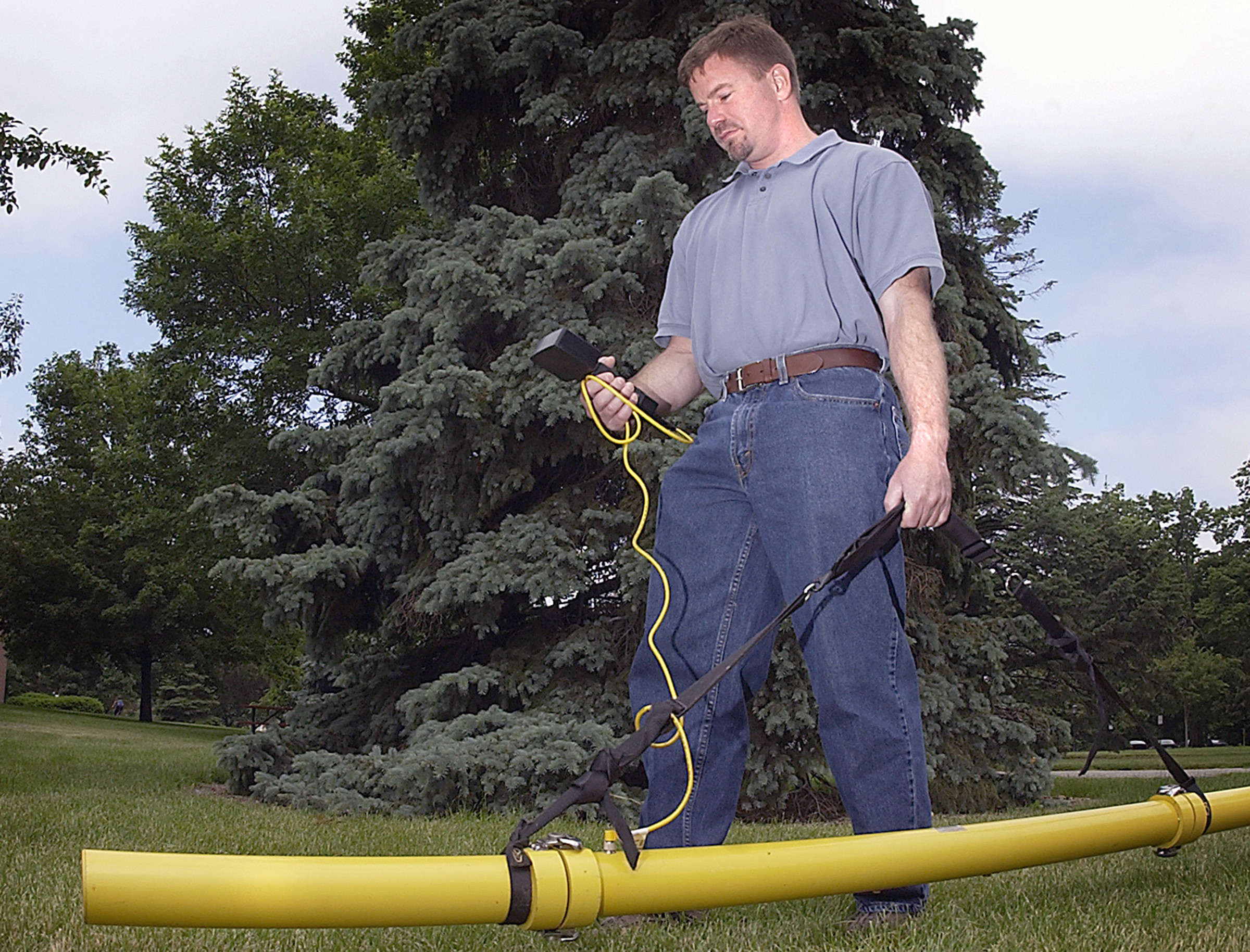 PHOTO CAPTION: Homeowners may no longer be forced to rip up their yards to find the source of septic tank system failures thanks to Brad Lee, an assistant professor of agronomy at Purdue. Lee has adapted a device that can non-invasively finds the source of such failures. (Purdue Agricultural Communications photo/Tom Campbell) A publication-quality photo is available at https://www.purdue.edu/uns/images/+2006/lee-electricseptic.jpg
