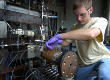 PHOTO CAPTION: James Sisco, a doctoral student in Purdue's School of Aeronautics and Astronautics, assembles portions of an experiment to study unstable combustion inside rocket engines. The NASA-funded work aims to help the U.S. space agency develop rockets faster and less expensively for future missions to Mars and the moon. The work might also help the U.S. Air Force develop rockets that use a kerosenelike fuel instead of liquid hydrogen, which must be cryogenically cooled and kept in insulated tanks. Using kerosene would enable engineers to create sleeker, more compact and lighter rockets that pack the same power as liquid hydrogen rockets. (Purdue News Service photo/David Umberger) A publication-quality photo is available at https://www.purdue.edu/uns/images/+2006/anderson-rocket.jpg