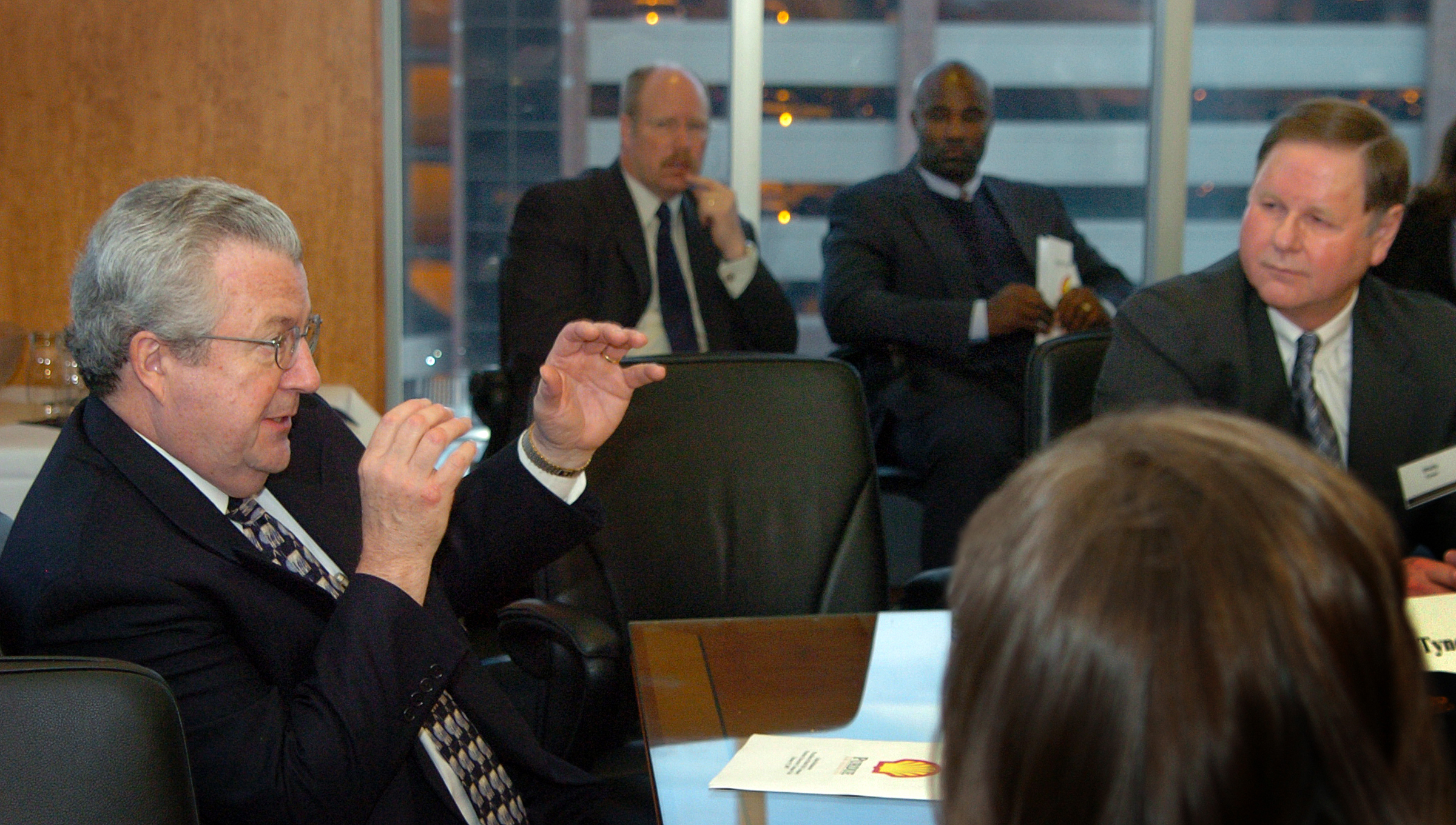 Shell Oil Co. President John Hofmeister, at left, speaks during a Purdue University meeting on Tuesday (Jan. 9) to highlight alternative energy sources while Wally Tyner, a professor in Purdue's Department of Agricultural Economics, on far right, listens. Other Purdue officials attending the meeting included Sally Mason, provost; Jay Gore, interim director of the Energy Center; and Bernie Tao, professor of agricultural and biological engineering. Hofmeister also met with students during the visit, which is part of a 50-city tour that Hofmeister is undertaking to speak with and listen to business and community leaders and others interested in alternative energies and the energy industry. After Hofmeister left Purdue, he went to Indianapolis to meet with the Economic Club of Indiana. (Purdue News Service photo/David Umberger) https://www.purdue.edu/uns/images/+2007/shell-hofmeister.jpg