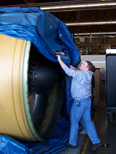 "This is a huge engine that produces twice the thrust of all three engines of a Boeing 727," said Thomas Wild, a professor of aviation technology. "This is an important acquisition because it gives students an up-close view of a modern engine, how it works and the location of the components. "This is the only such engine on display at any college or university that I am aware of." College of Technology Dean Dennis Depew said donations like this are increasingly important. "Pratt & Whitney's gift to Purdue is a perfect example of the great things that can happen when industry and academia create partnerships," he said. "This generous gift will benefit not just students, but also the industry by helping assure that our aviation technology graduates are equipped to make a real impact in their fields." The engine is located at the power plant lab at Hangar 2 of the Purdue Airport and remains stationary. But it still gives students in Wild's large engine systems class a hands-on education using an engine that powers today's commercial aircraft. "These aeronautical technology students will pursue careers in the manufacture and repair of such engines, so this gift will give them a competitive advantage in a highly skilled industry," said Thomas Carney, head of the aviation technology department. "We are very pleased to be able to provide them with a top-of-the-line engine that they've been studying about so they can apply their book knowledge to something tangible." Pratt & Whitney used the donated engine, worth an estimated $500,000, in its development and testing process, Wild said. Wild said what really sets the PW4098 engine apart is the size and power of the engine fan. The entire engine was so large, in fact, that it had to be shipped over the road from Connecticut to Indiana. "The fan is 112 inches in diameter and produces 80 percent of the engine's thrust," he said. "The fan can also be disassembled blade by blade, so students can see how it all fits together." The department had been seeking to acquire a 4000-series engine for the last several years. John Beering, a Purdue alumnus and son of former Purdue President Steven Beering, worked with Pratt & Whitney to make the donation possible. "At the time, John Beering worked for United Technologies, which is the parent company of Pratt & Whitney," Wild said. "John met with some people in the aviation technology department while visiting here in 2005 and, because of his ties to Purdue, basically became the catalyst who made this happen." This fall FedEx Corp. donated a retired cargo Boeing 727 to Purdue for teaching purposes. In addition to its large fleet of piston-powered and turbine training aircraft, Purdue currently has one other airliner used for teaching in aviation technology - a 1970s-era Boeing 737 passenger airplane.Writer: Kim Medaris, (765) 494-6998, kmedaris@purdue.edu Sources: Thomas Wild, (765) 494-9968, wildt@purdue.edu Thomas Carney, (765) 494-9954, tcarney@purdue.edu Jerry Alberts, director of corporate relations for the College of Technology, (765) 494-0885, jlalberts@purdue.edu