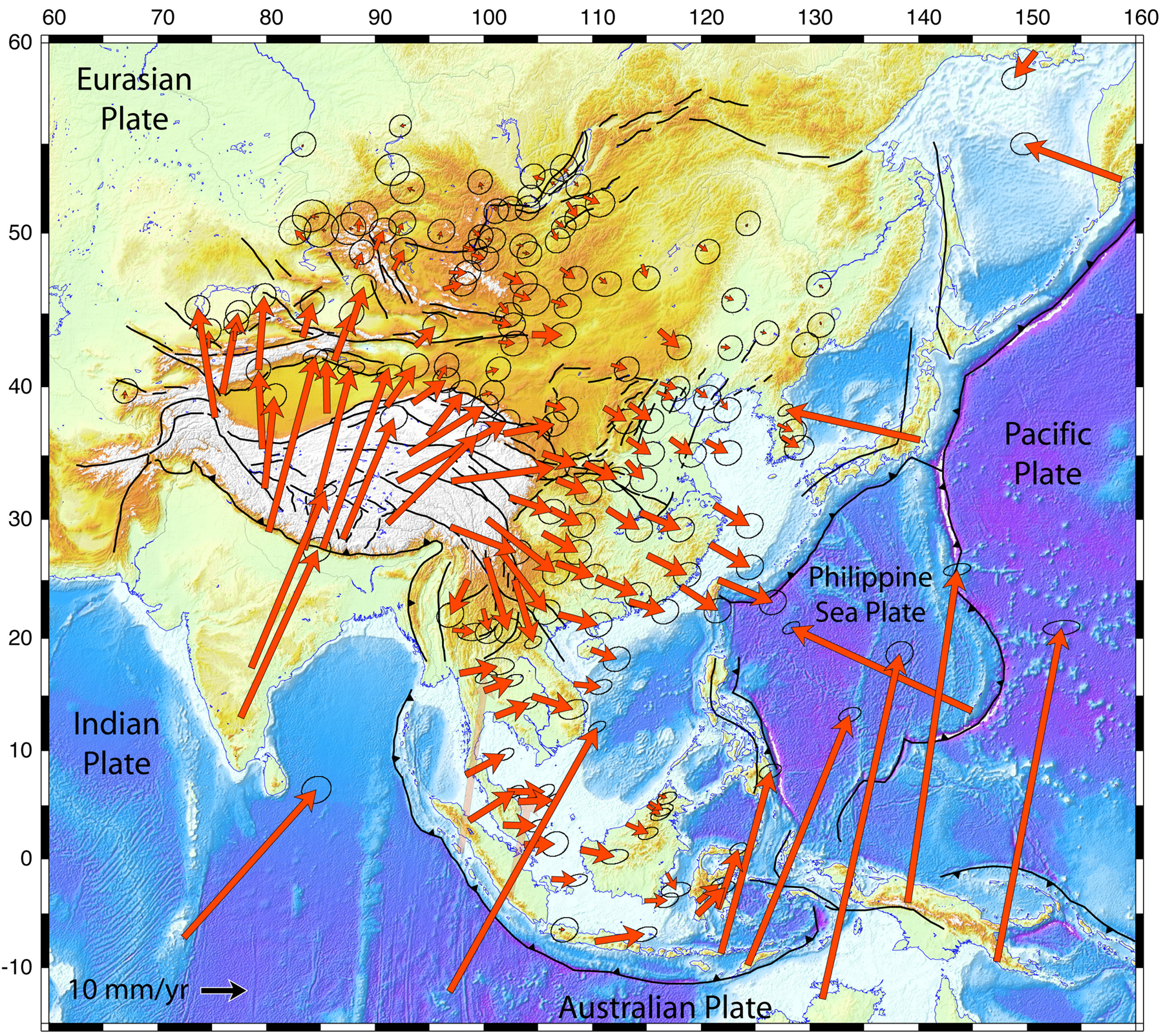 E. Calais, L. Dong, M. Wang, Z. Shen, and M. Vergnolle After decades of research on continental tectonics, there is still no consensus on the mode of deformation of continents or on the forces that drive their deformation. In Asia the debate opposes edge-driven block models, requiring a strong lithosphere with strain localized on faults, to buoyancy-driven continuous models, requiring a viscous lithosphere with pervasive strain. Discriminating between these models requires continentwide estimates of lithospheric strain rates. Previous efforts have relied on the resampling of heterogeneous geodetic and Quaternary faulting data sets using interpolation techniques. We present a new velocity field based on the rigorous combination of geodetic solutions with relatively homogeneous station spacing, avoiding technique-dependent biases inherent to interpolation methods. We find (1) unresolvable strain rates (<3 x10^9/yr) over a large part of Asia, with current motions well-described by block or microplate rotations, and (2) internal strain, possibly continuous, limited to high-elevation areas.
