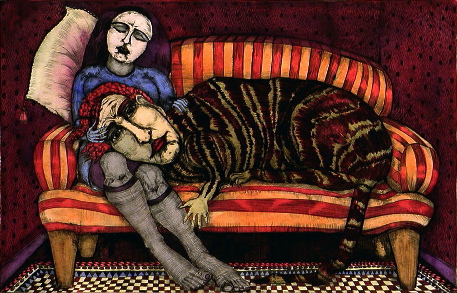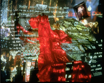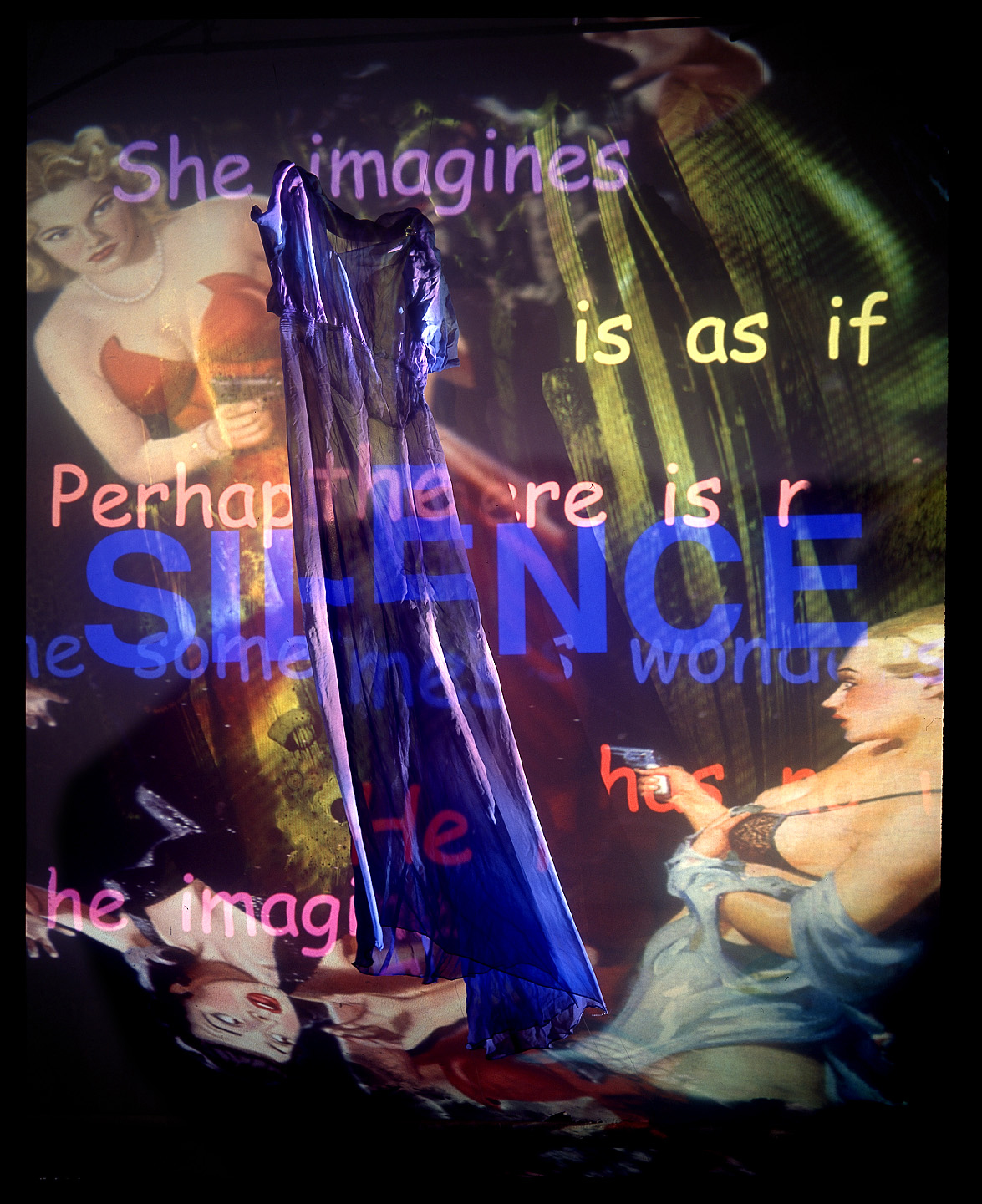 Densely layered, darkly seductive and neon-lurid, Calvin's photographs create and recreate references to the memories, impulses and fantasies that tug at the edges of our conscious minds, Martin said. Her images are created by montaging projected imagery and found objects into room-sized assemblages, which she then photographs in color. "Imagery and text fragments gleaned from advertising, story books, movie posters, romance and mystery novels, along with dolls, dresses and other props, all conspire in Calvin's final photographs to reflect and blur demarcations between evil and innocence, fact and fiction, childhood innocence, sexuality, desire, tenderness and violence," Martin said.