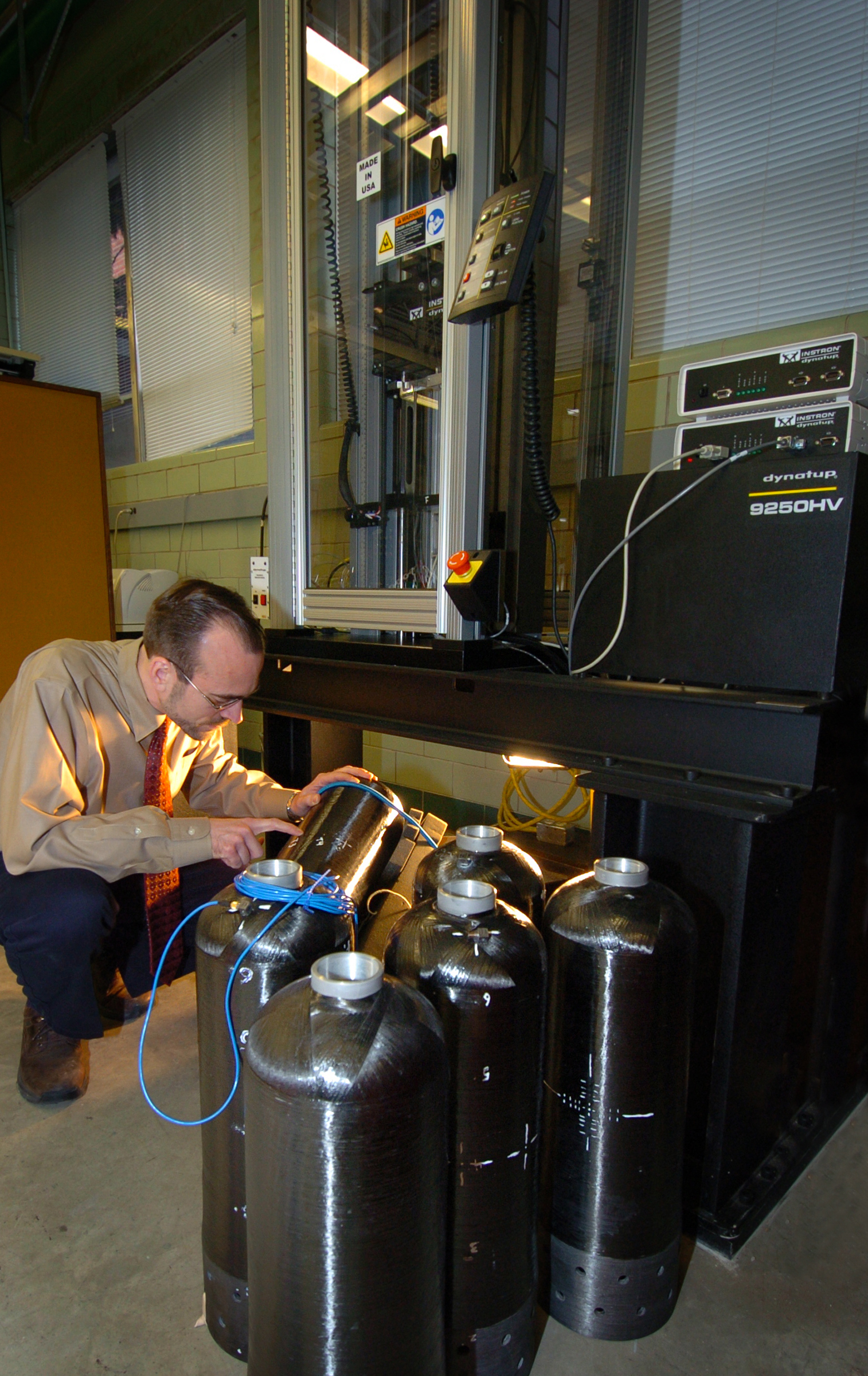 Missiles are sometimes damaged when struck by rocks and debris kicked up by helicopter rotors or when mishandled during shipping or maintenance. Unlike missiles made of metallic alloys, which often show external signs of damage such as cracks or dents, damage in the new "filament wound" composite materials may not reveal telltale signs, said Douglas Adams, an associate professor of mechanical engineering. The new monitoring system uses a mathematical model to pinpoint the location and severity of impacts based on vibration data collected by a sensor called a triaxial accelerometer. "We have shown that 98 percent of the time we can detect, locate and quantify the force of impacts," Adams said. "This information is very useful because it enables the monitoring system to determine within seconds whether an impact is beyond the design threshold and is great enough to likely cause serious damage." Findings will be detailed in a research paper to be presented Wednesday (March 21) during an International Society for Optical Engineering conference. The conference, Smart Structures and Materials and Non-Destructive Evaluation and Health Monitoring, takes place through Thursday (March 22) in San Diego. The paper was written by Adams, graduate student Nick Stites, undergraduate student Carlos Escobar, and doctoral student Jonathan White, all in Purdue's School of Mechanical Engineering; and Matt Triplett, an engineer from the U.S. Army's Aviation and Missile Research, Development and Engineering Center. The research focuses on the missile casing, a 7-inch-wide, 30-inch-long central segment located between the rocket motor and warhead. "The casing is essentially a cylinder that holds the solid rocket fuel, and it has to withstand the high pressures created as the fuel burns," said Adams, whose research is based at Purdue's Ray W. Herrick Laboratories. The researchers are using a 15-foot-tall "impact tower" that rams a steel rod into the casing with enough force to punch holes in military armor. The testing simulates impacts from debris, tools striking the casing or mishaps, such as personnel accidentally dropping a missile. "These sorts of impacts can cause damage that cannot be detected by visual inspections," Adams said. The casings are made out of carbon fibers, Kevlar or other materials wound in layers. Missiles made of the composite materials perform better than their metallic counterparts because the casings are up to 40 percent lighter than those made from aluminum alloys. Their light weight also makes them less expensive to ship and easier to handle. In addition to detecting damage caused by an accident, the technique also could determine how durable the material is after long-term storage and exposure to the environment. "The military stores weapons systems for a long time, sometimes years, and then they deploy them, so you want to know how they are affected by factors such as humidity, ultraviolet radiation and other conditions," Adams said. "The ultimate goal of this work is to create a system that could be permanently installed in missiles to analyze the structural health in real time." Another goal is to gather data to help engineers design more impact-resistant casings in the future. Research shows that some designs are more prone to damage because the force of impact concentrates in a small area. "You want a material system that distributes that impact load along many fibers so that no one fiber is carrying too much load, which could cause it to break," Adams said. The more damage, the less pressure the casing can withstand before bursting. A major challenge is designing an effective monitoring system that uses only one sensor. "You can't be putting a lot of sensors everywhere because there are weight restrictions," Adams said. "So you have to figure out what you can do with so-called minimal sensing, with the fewest number of sensors possible." The triaxial accelerometer measures vibrations from three directions. When engineers strike the casing at various points with a hammer, vibrations travel through the structure and are recorded by the sensor. Data from those measurements are then used to fine tune a mathematical model needed for the monitoring system. Recent findings indicate the system effectively tracks the location and severity of impacts using only one sensor. Future testing might simulate "ballistic impacts" from bullets or shrapnel from improvised explosive devices, Adams said. The same technique could be applied to commercial aircraft and spacecraft, as well as bridges, railways and other elements of America's aging transportation infrastructure. The research is funded by the U.S. Army Research Office.Writer: Emil Venere, (765) 494-4709, venere@purdue.edu Source: Douglas Adams, (765) 496-6033, deadams@purdue.edu