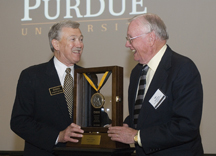 In future years, the medal will be presented by Armstrong or his designee at the annual University Honors Convocation. Armstrong received a bachelor's degree from Purdue in aeronautical and astronautical engineering in 1955 and was awarded an honorary doctorate in engineering from Purdue in 1970. On July 20, 1969, Armstrong became the first person to walk on the moon as commander of Apollo 11. In addition to the Armstrong Medal, Jischke was presented with a Sagamore of the Wabash, the highest honor that the governor of Indiana bestows. It is traditionally awarded to those who have rendered a distinguished service to the state or to the governor. Among those who have received Sagamores have been astronauts, presidents, ambassadors, artists, musicians, politicians and others who have contributed to Hoosier heritage. Purdue officials announced gift totals so far for scholarships established in honor of Martin and Patty Jischke. An anonymous donor and the Purdue University Retirees Association each created new Purdue Opportunity Awards. The award program, created by President Jischke in 2004, helps creates full scholarships for incoming students who have demonstrated financial need, personal hardship or other extenuating circumstances. The program combines private gifts with federal and state funding to provide a total financial aid package equal to a student's tuition, room and board for the first year at Purdue and currently pays up to $2,500 of their need in the second year. Every year, at least one student from each of Indiana's 92 counties is eligible for the award. The Purdue University Retirees Association is raising funds to create at least one Purdue Opportunity Award scholarship that will bear its name. An anonymous donor who contributed $1.5 million in honor of the Jischkes, designated $500,000 of that to establish a new Purdue Opportunity Award scholarship in the Jischkes' names. The rest of that donor's gift will support the Purdue Science Bound program and another needs-based scholarship. Another scholarship program, the Patty Jischke Kids are the Future endowment, has been established with an initial $20,000 gift by Linda Rohrman, a Lafayette philanthropist and co-chair of the Community Campaign segment of the Campaign for Purdue. This endowment will provide scholarships to ensure that Purdue families with financial hardships can take advantage of the new 8,100-square-foot child-care center that is scheduled to open in summer 2008. Four hundred fifty-two other donors have contributed $188,822 to date, bringing the total raised for these two scholarship programs to almost $1.709 million. Jischke, the 10th president in the university's 138-year history, is retiring this summer after seven years as Purdue's president. Writer: Kim Medaris, (765) 494-6998, kmedaris@purdue.edu Source: Murray Blackwelder, vice president for advancement, (765) 496-2144, mblackwelder@purdue.edu